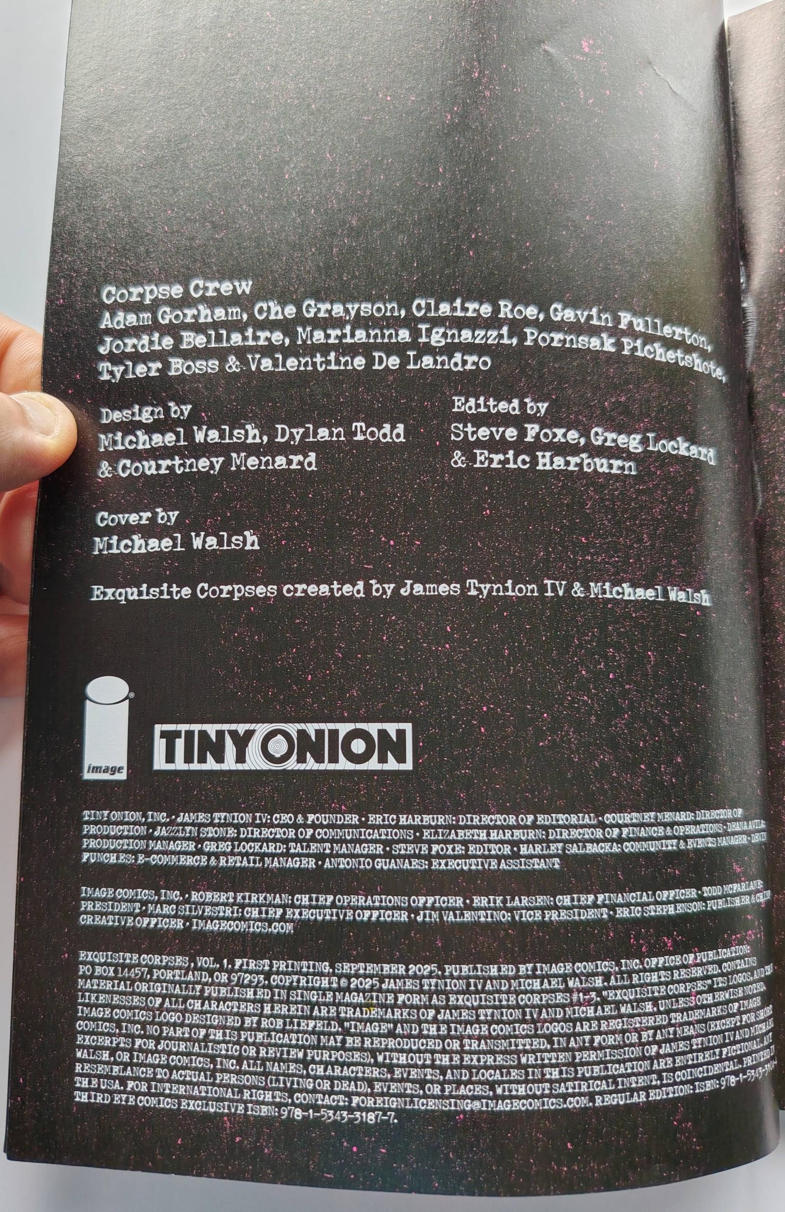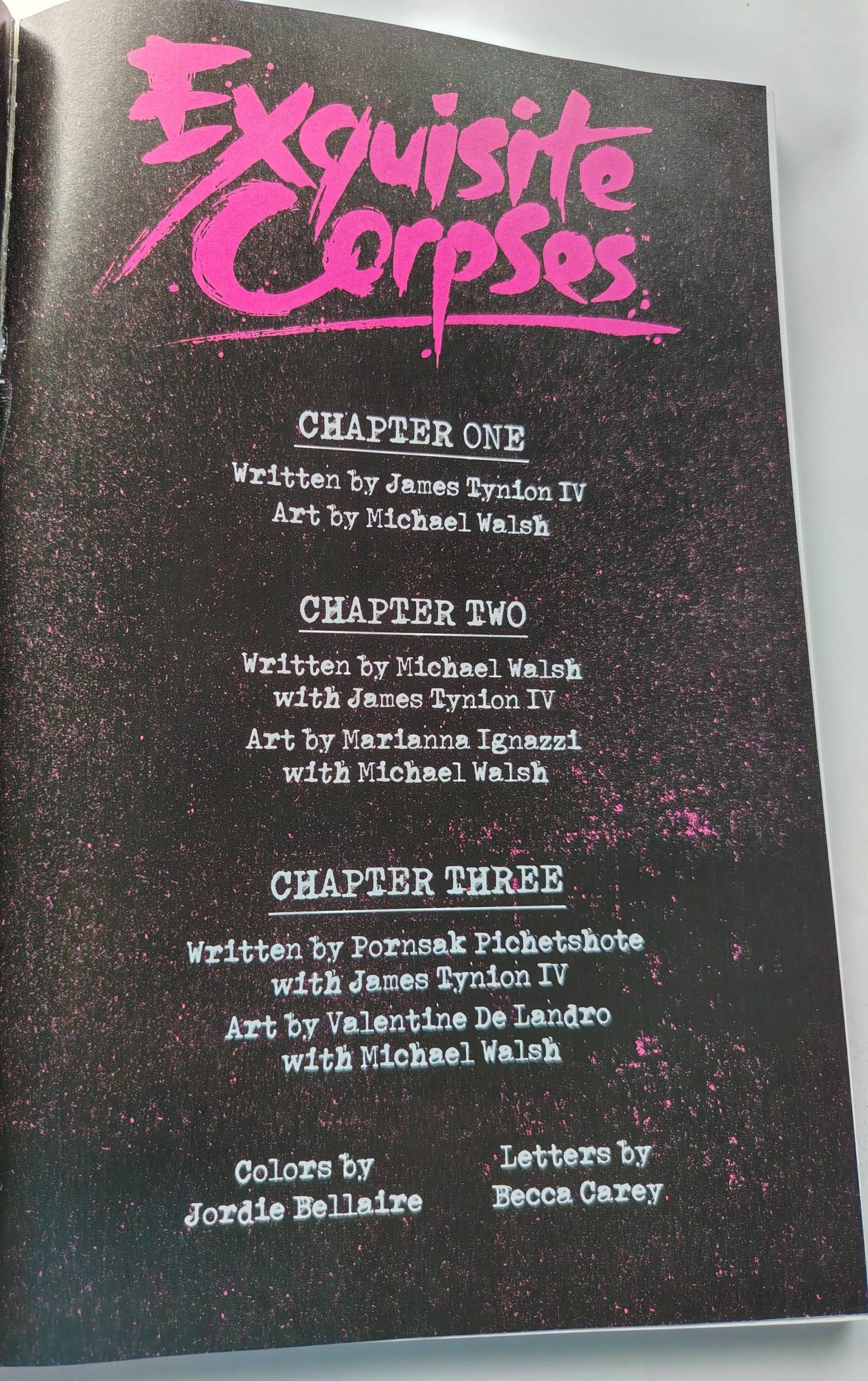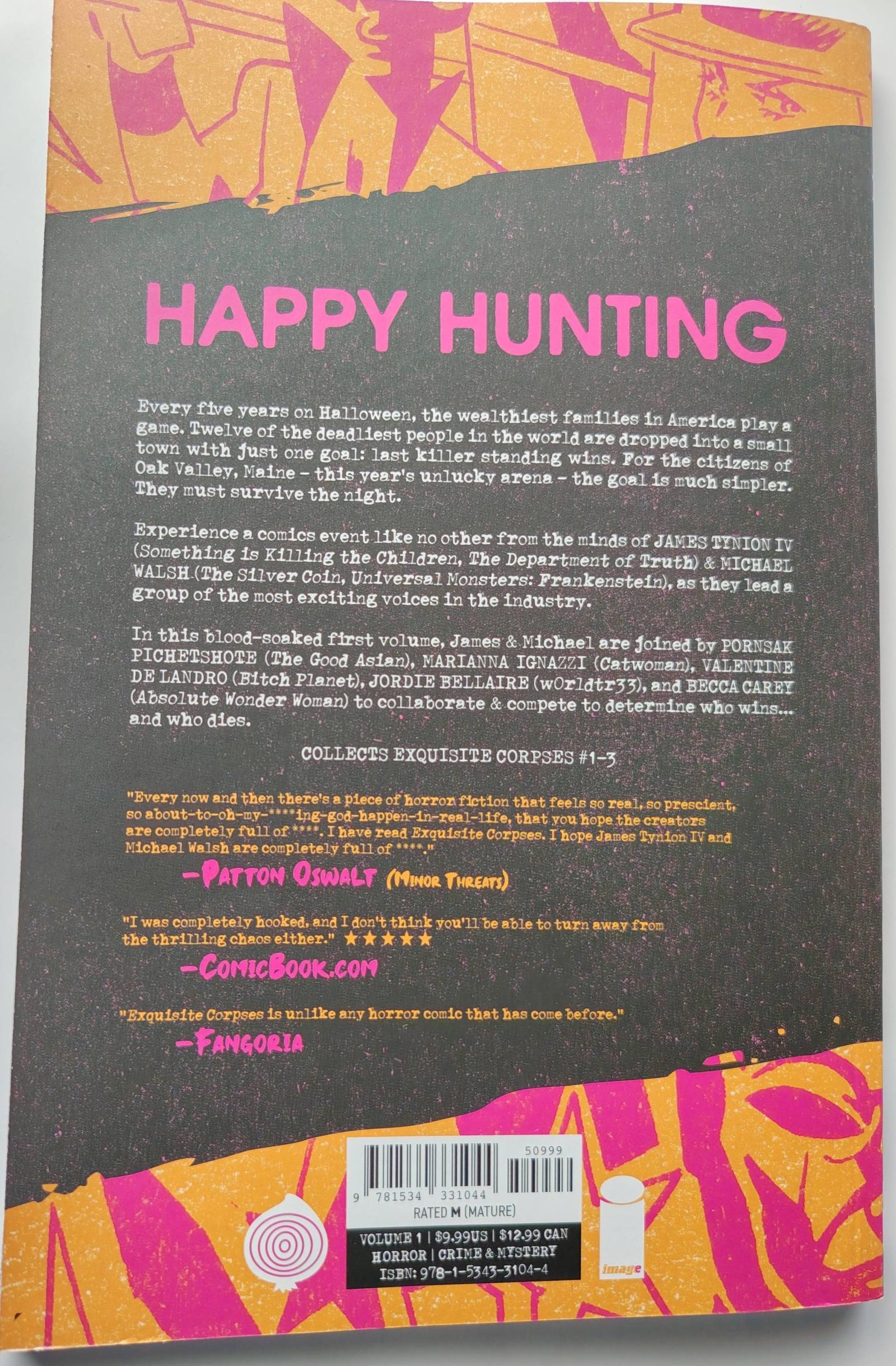 Exquisite Corpses Trade Paper Back (TPB) volume 1 collects issue no. 1 to 3, Fox Mask Killer on the cover surrounded by 11 other killers in the background. Writer: James Tynion, Michael Walsh, Pornsak Pichetshote. Art by Michael Walsh, Marianna Ignazzzi, Valentine De Land Rover. First printing.(New copy)