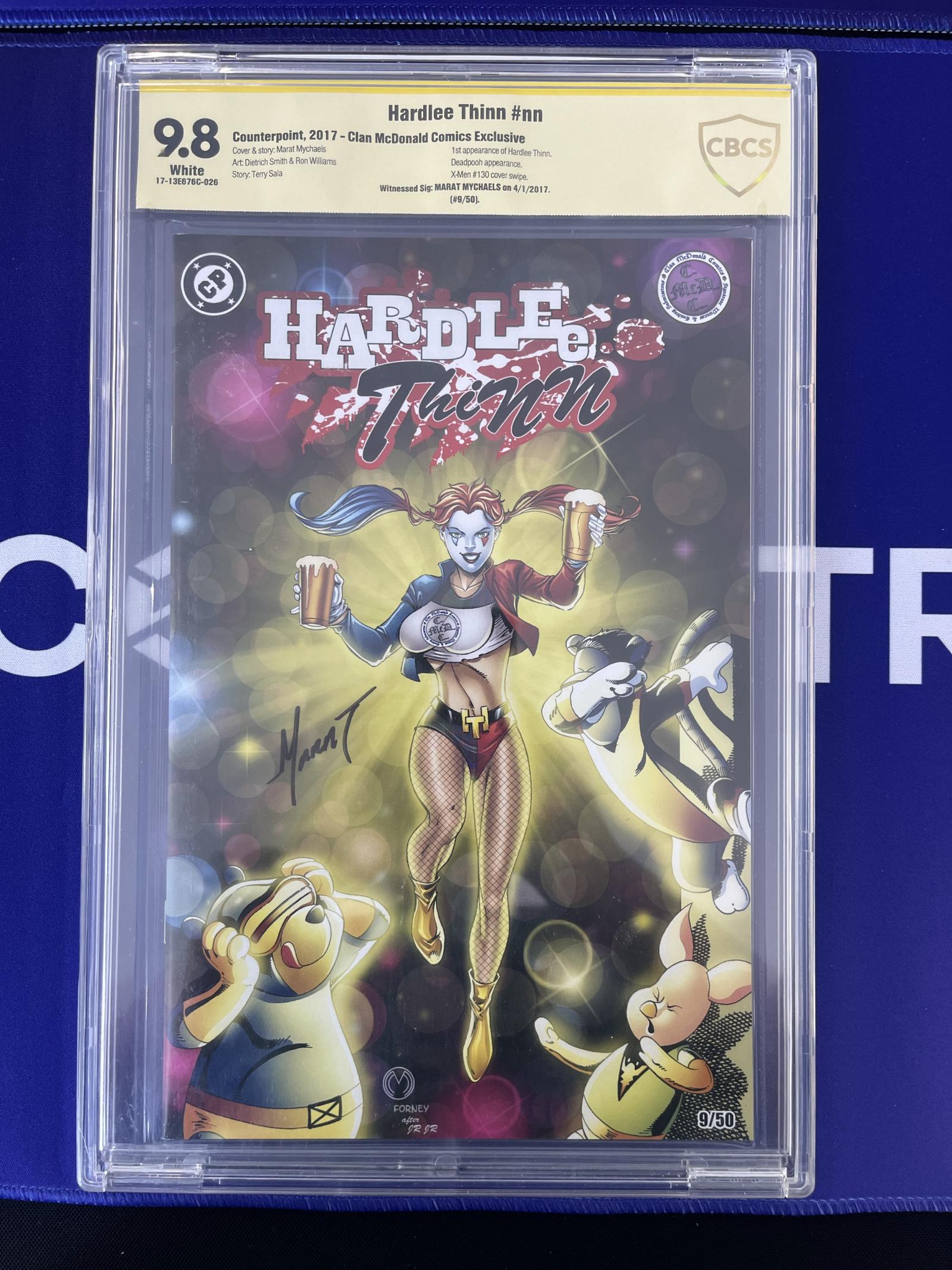 Hardlee Thinn #nn from Counterpoint 2017, a Clan McDonald Comics exclusive. Features the first appearance of Hardlee Thinn and Deadpooh cameo. This limited edition (#9 of 50) is signed by artist Marat Mychaels and graded CBCS 9.8 with white pages. Artwork by Dietrich Smith and Ron Williams, story by Terry Sala. A high-grade collectible modern comic with verified signature.