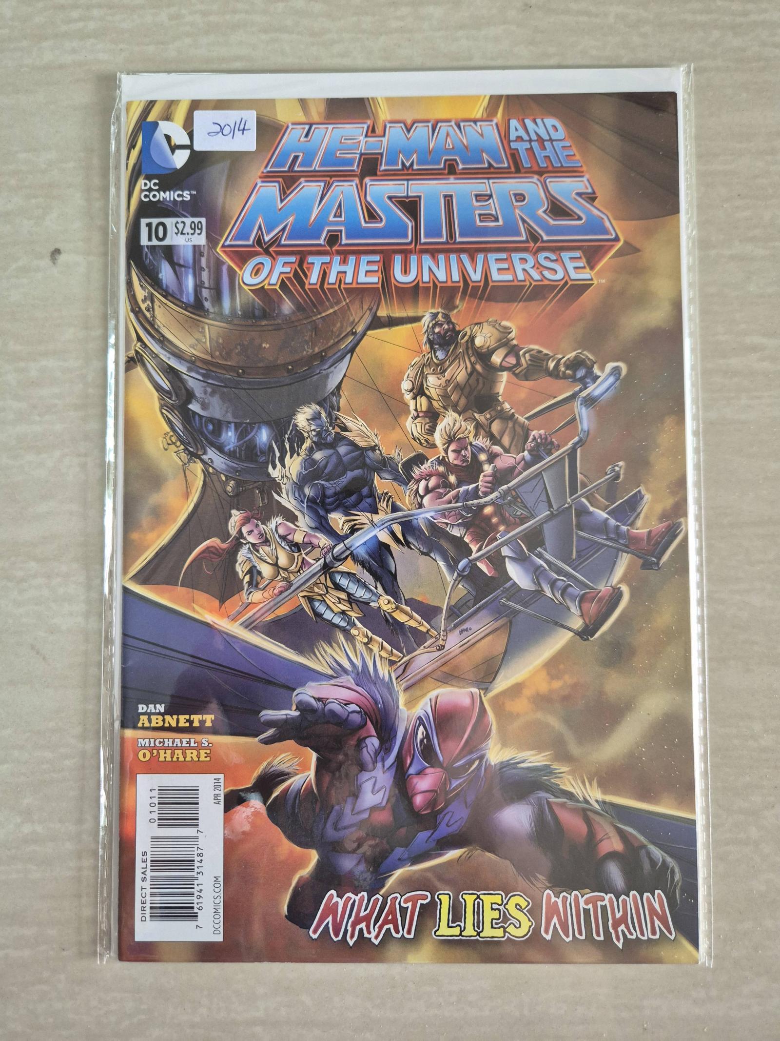 A modern comic book from DC Comics featuring 'He-Man and the Masters of the Universe' issue #10. The cover art showcases key characters in an action scene and is titled 'What Lies Within'. Written by Dan Abnett with art by Michael S. O'Hare. Comic is bagged and boarded for protection.