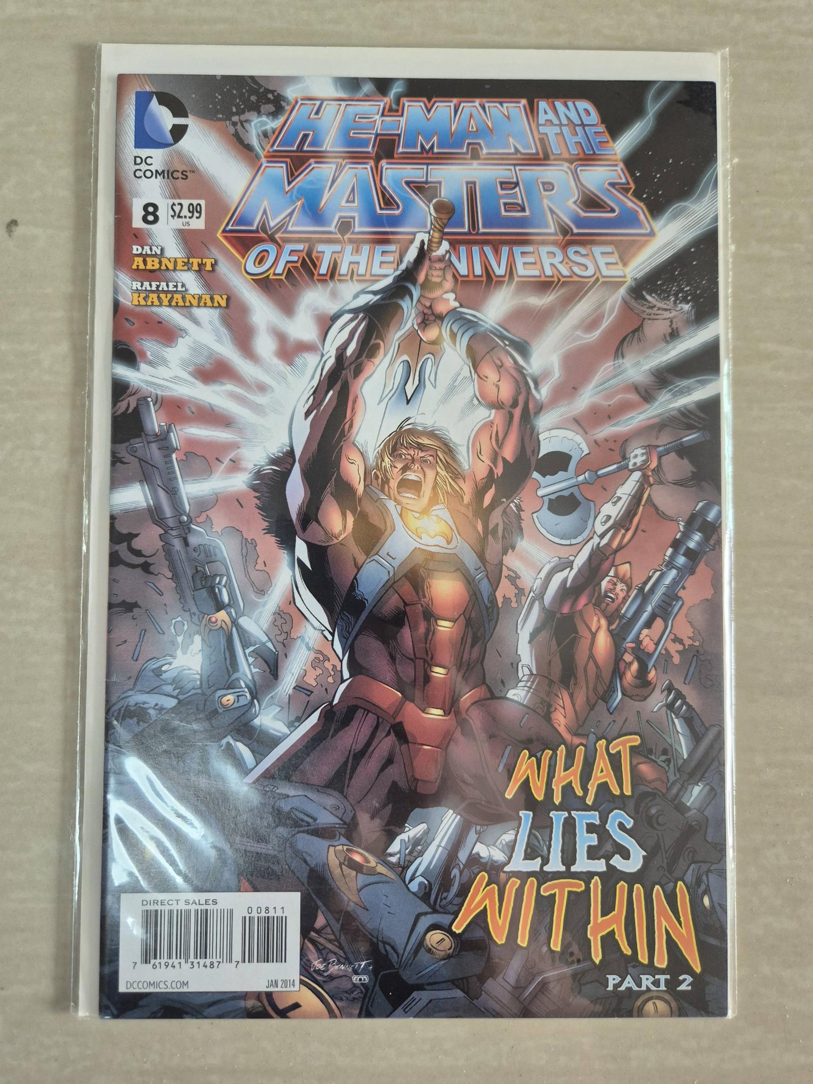 He-Man and the Masters of the Universe issue #8, published by DC Comics in January 2014. Written by Dan Abnett with artwork by Rafael Kayanan. This modern comic features a dynamic cover showcasing He-Man in battle, part 2 of the 'What Lies Within' story arc. A collectible contemporary comic book for fans of the series and the franchise.