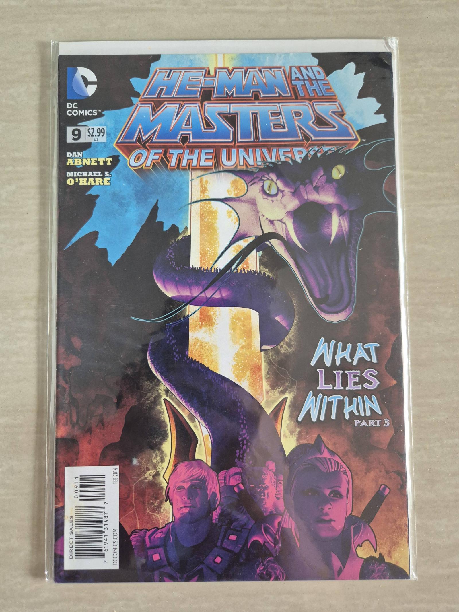 A modern comic book from DC Comics featuring He-Man and the Masters of the Universe. Issue #9 titled 'What Lies Within Part 3' with story by Dan Abnett and art by Michael S. O'Hare. The comic is bagged and boarded, preserving its condition and vibrant cover art.