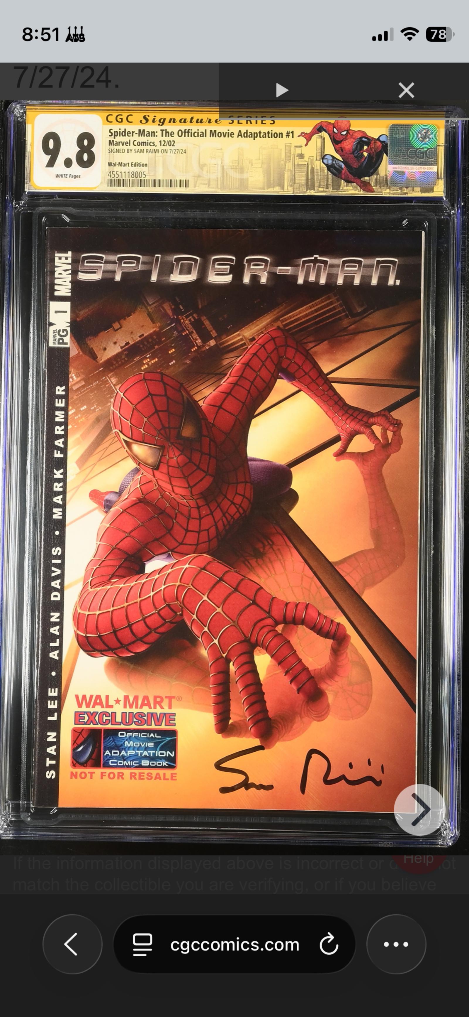CGC Signature Series graded 9.8 Spider-Man: The Official Movie Adaptation #1 (Marvel Comics, 12/02). This Wal-Mart exclusive edition features a cover signed by director Sam Raimi on 7/27/24. Stunning condition with white pages and encapsulated for protection. A must-have for Spider-Man and Marvel collectors.