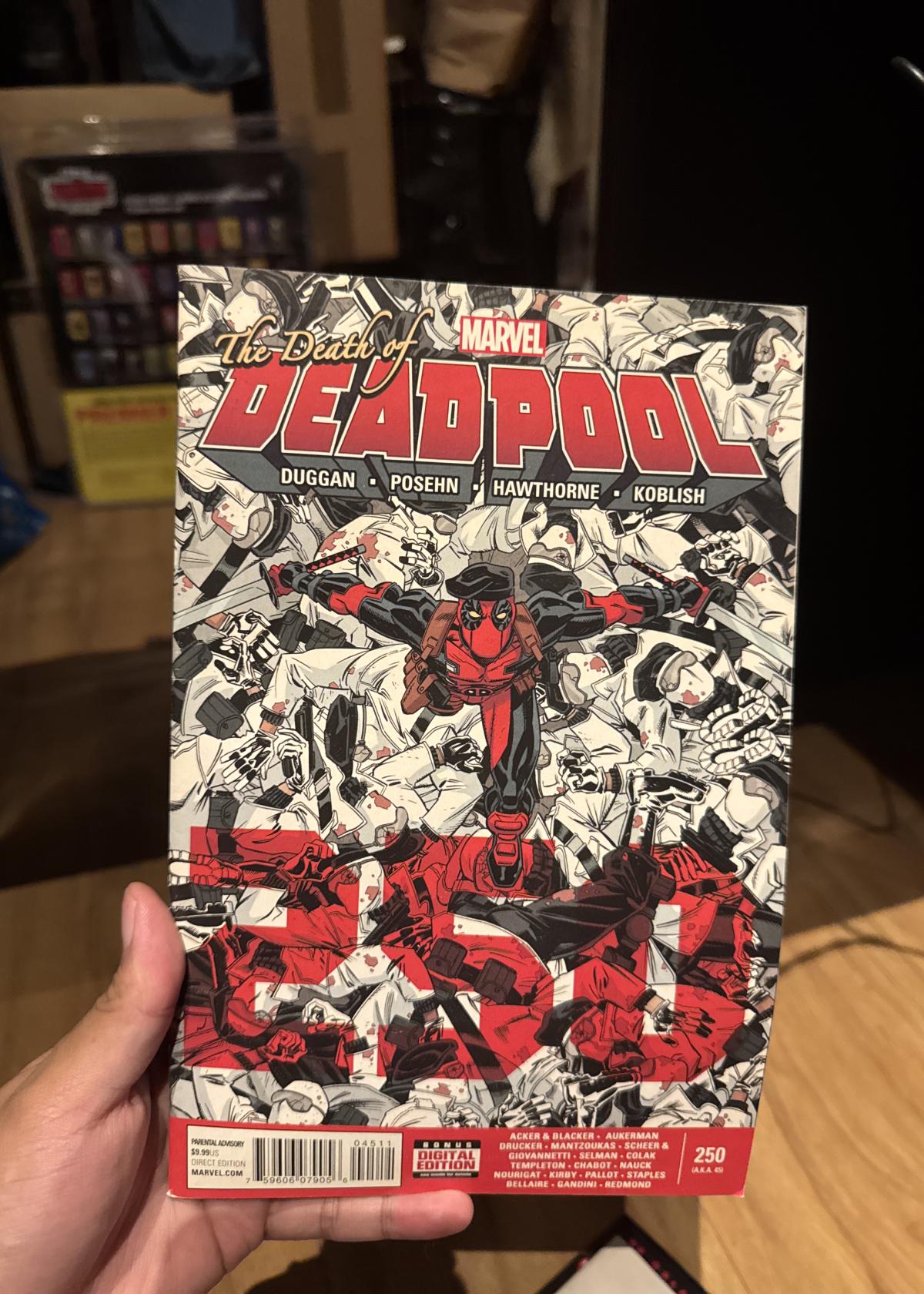 Deadpool #250, also known as issue #45 in the series, is a significant milestone published by Marvel Comics in 2015. This oversized issue marks the 'Death of Deadpool' storyline, featuring a dramatic battle scene on the cover. Written by Gerry Duggan and Brian Posehn, with artwork by Mike Hawthorne and Scott Koblish, the comic includes multiple stories showcasing Deadpool's closest friends and allies. The issue is notable for its engaging narrative and is a key addition for Deadpool fans and collectors.