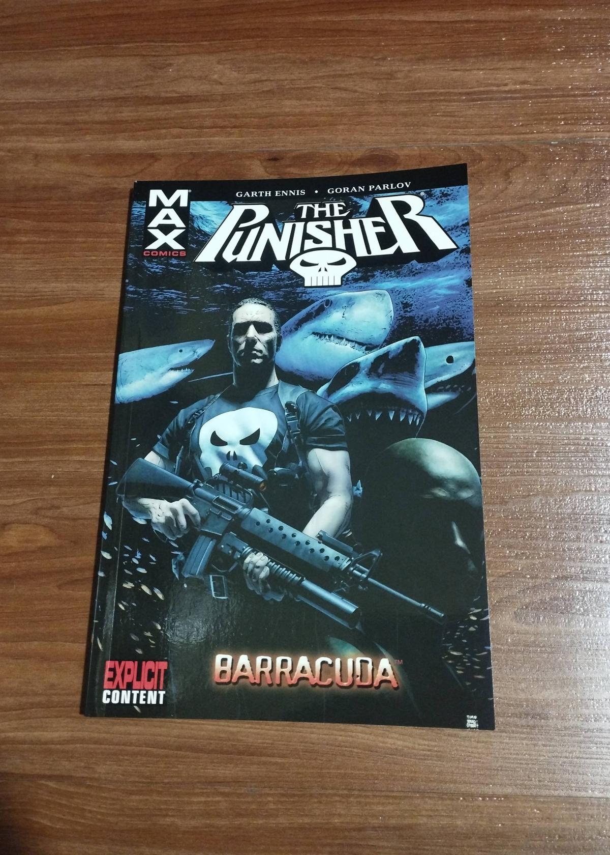 This is a modern comic from the acclaimed Punisher MAX series, titled 'Barracuda,' written by Garth Ennis with art by Goran Parlov. Published by MAX Comics, it is known for its mature storytelling and explicit content. This volume features Frank Castle (The Punisher) facing off against the dangerous and unpredictable Barracuda, set in a gritty crime-filled world. The cover and interior pages appear to be crisp with vibrant color and little visible wear.