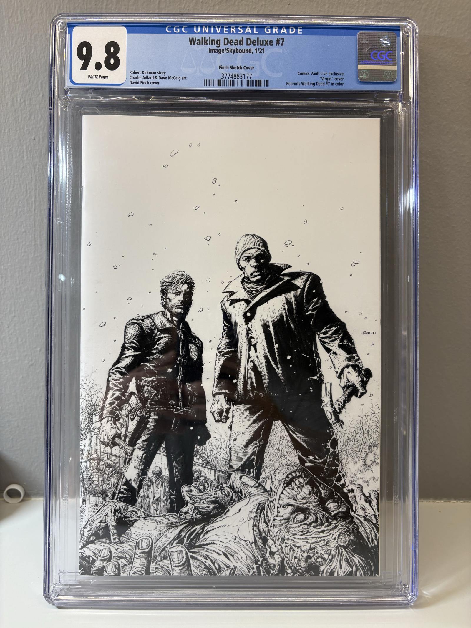 Walking Dead Deluxe #7 from Image/Skybound, dated January 2021. This is the Finch Sketch Cover variant, graded CGC 9.8 with white pages. The comic features a striking black-and-white sketch cover and is a Comics Vault Live exclusive "Virgin" cover. The issue includes the story by Robert Kirkman with art by Charlie Adlard and Dave McCaig. This near-mint graded collectible is a must-have for modern comic collectors and Walking Dead fans.