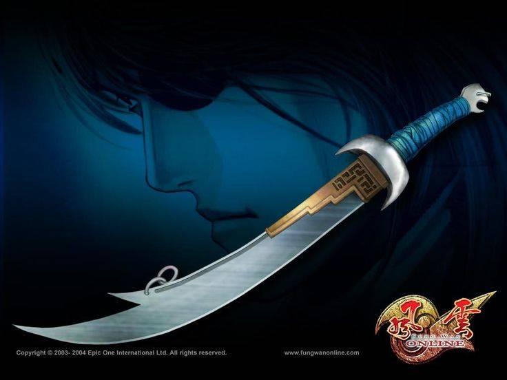 A detailed replica sword from the Fung Wan Online anime series, featuring a curved blade with intricate engravings and a blue wrapped handle. This collectible is perfect for fans and collectors of anime memorabilia.