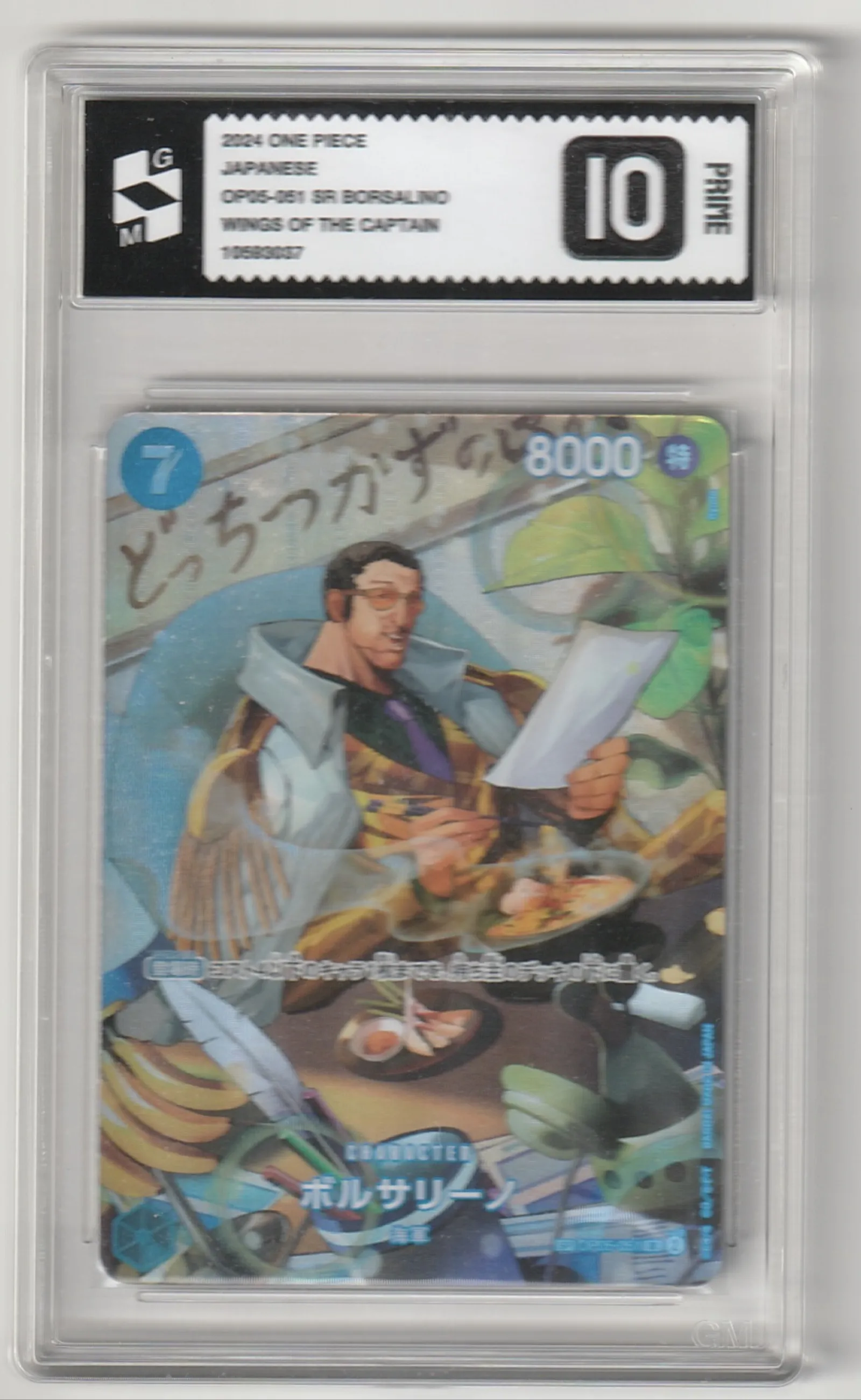 A highly collectible 2024 One Piece trading card featuring SR Borsalino from the Wings of the Captain series, graded Prime 10 by SGM. The card is in pristine condition and encased in a protective slab, showcasing excellent centering and surface quality. This Japanese card is a must-have for dedicated One Piece TCG enthusiasts and collectors.
