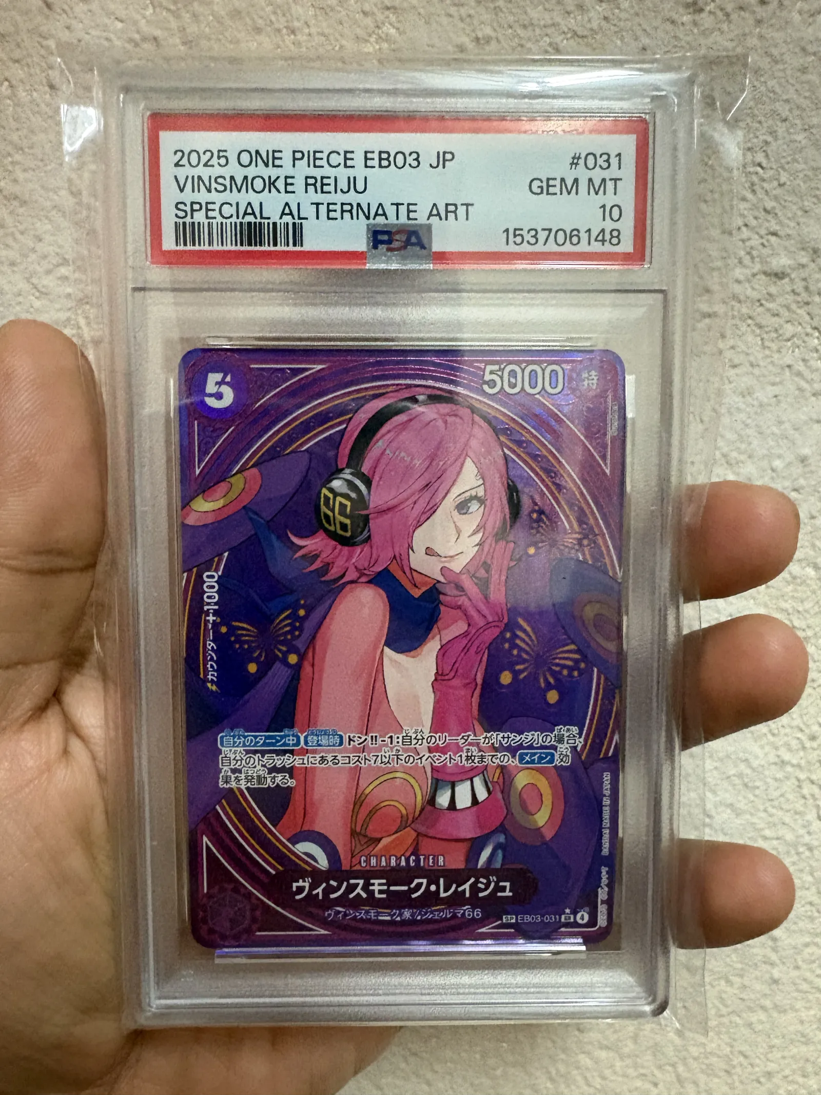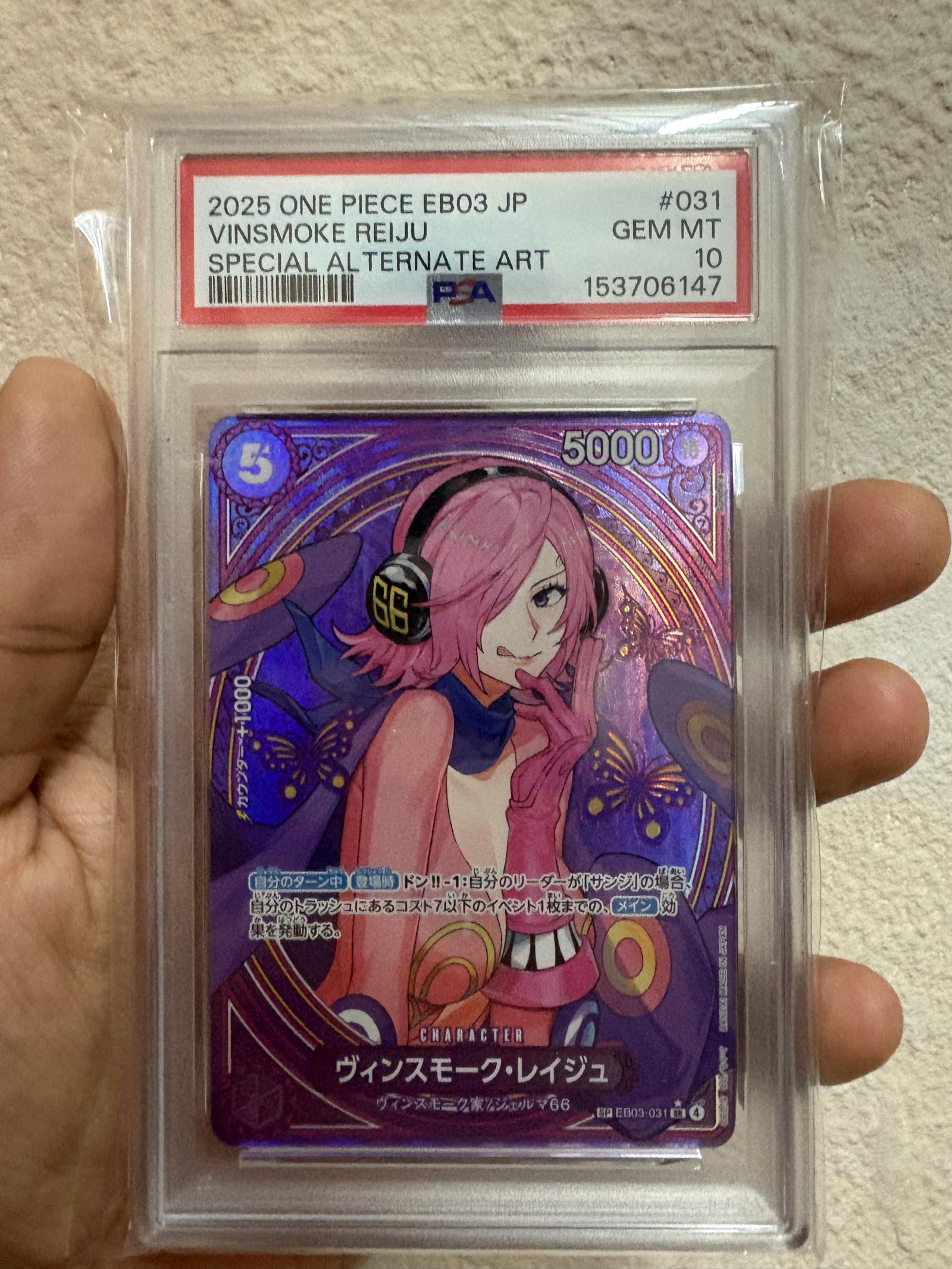 Item condition & grading: This is a PSA-graded Gem Mint 10 example of the 2025 One Piece (Japanese) EB03-031 Vinsmoke Reiju Special Alternate Art. The card is sealed in a PSA holder and labeled “GEM MT 10” (PSA certification visible on the slab). The card’s edges, surface, corners and centering present at PSA’s highest grade and the slab remains intact and clear.