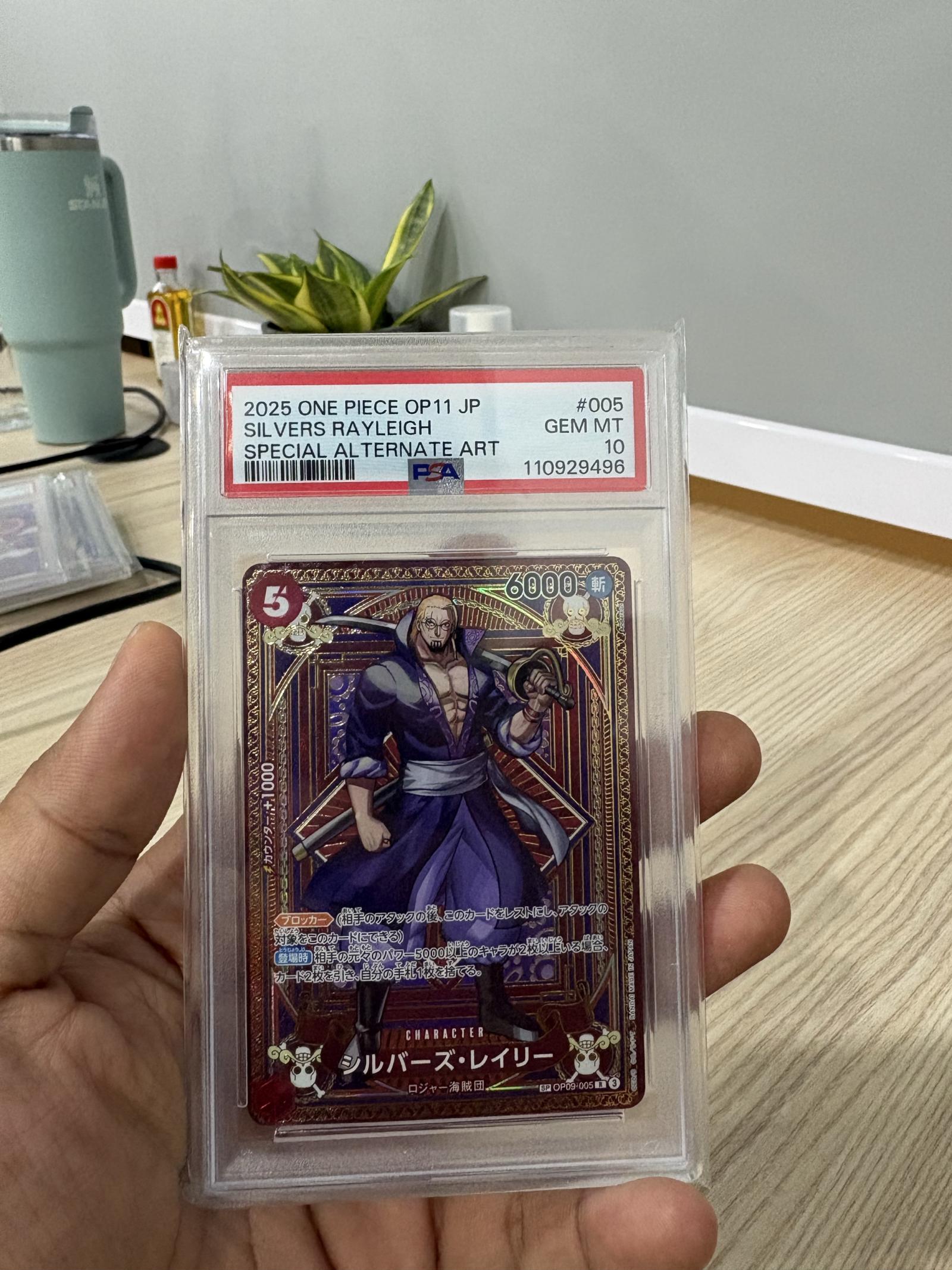 Collectibility and playability: this is primarily a collector-grade piece — the alternate art and PSA 10 slab significantly increase market desirability and resale value among One Piece TCG collectors and fans of Silvers Rayleigh. While playable in formats that accept Japanese OP11 cards, its highest value is as a graded display/collection centerpiece due to the alternate art and Gem Mint grading.