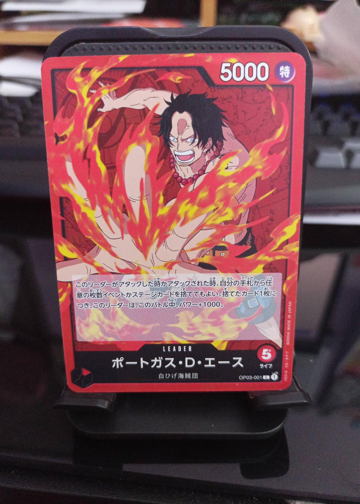 This is a One Piece Card Game Leader card featuring Portgas D. Ace. The card is from the Japanese set, identified by the set code OP03. As a Leader card, it is central to deck-building and gameplay in the One Piece TCG Meta, particularly for decks based on the Whitebeard Pirates. Artist and foil status are not specified. This card is not graded or slabbed.