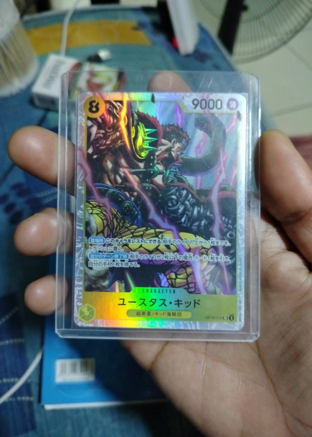 This listing is for an Eustass Kid SR (Super Rare) holographic trading card from the One Piece TCG, specifically card OP10-112 in its original Japanese release. The card is in near mint condition, showing virtually no signs of play or handling. It remains ungraded and has been carefully kept in a protective sleeve to preserve its pristine state.