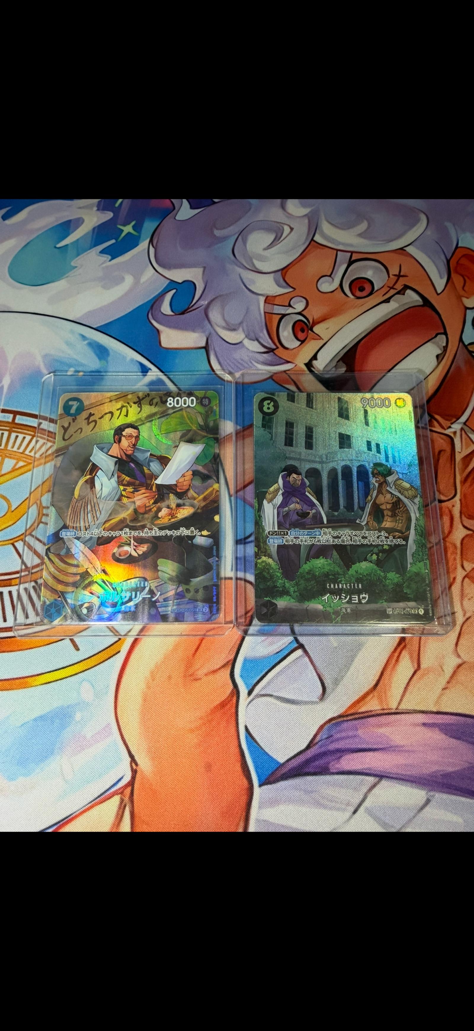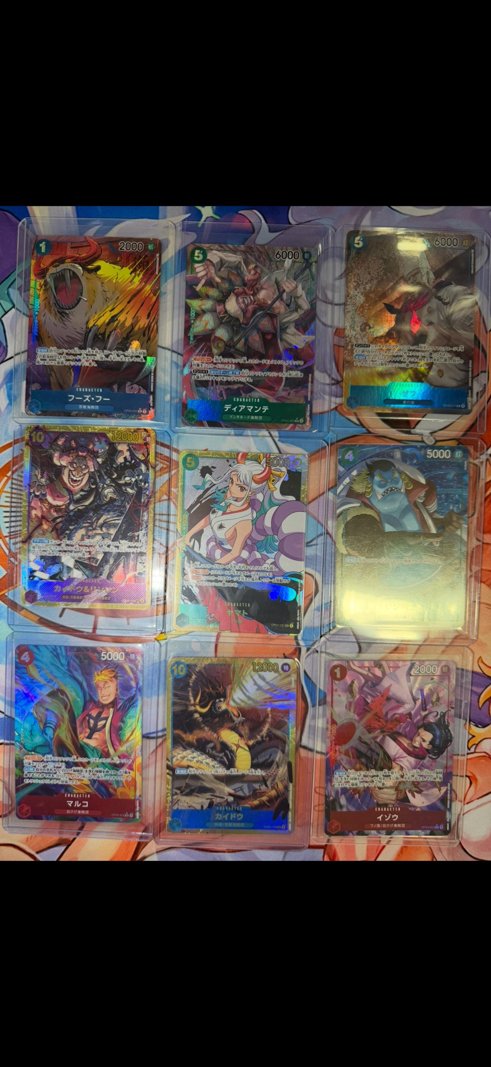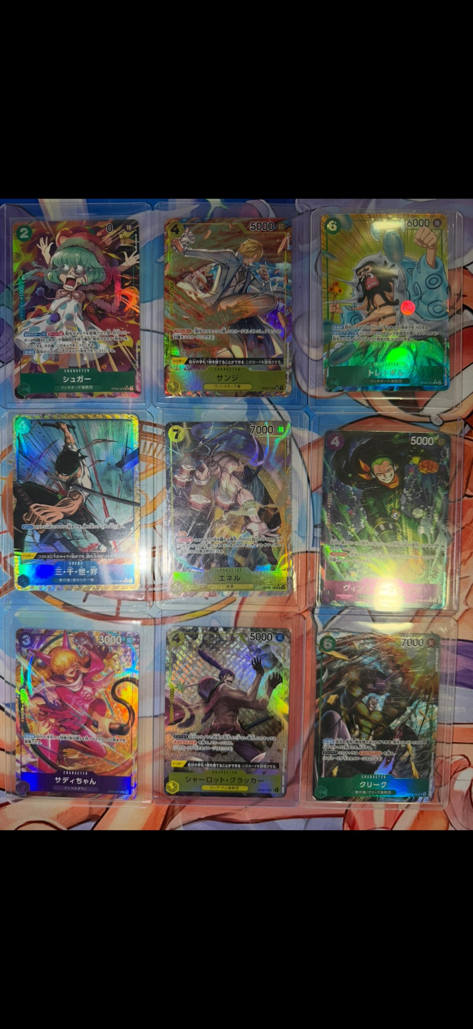 A collection of 11 Japanese One Piece trading cards featuring popular characters such as Sanji, Enel, and Sugar. All cards are holographic and in protective sleeve cases. Cards display vibrant artwork and game stats in excellent condition. Perfect for collectors and fans of the One Piece TCG.