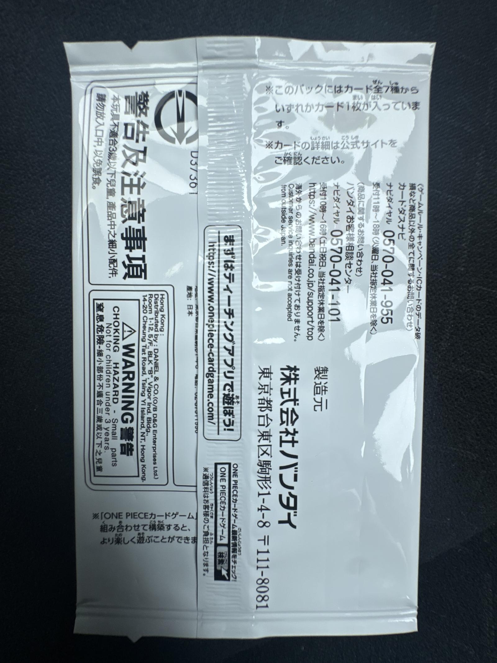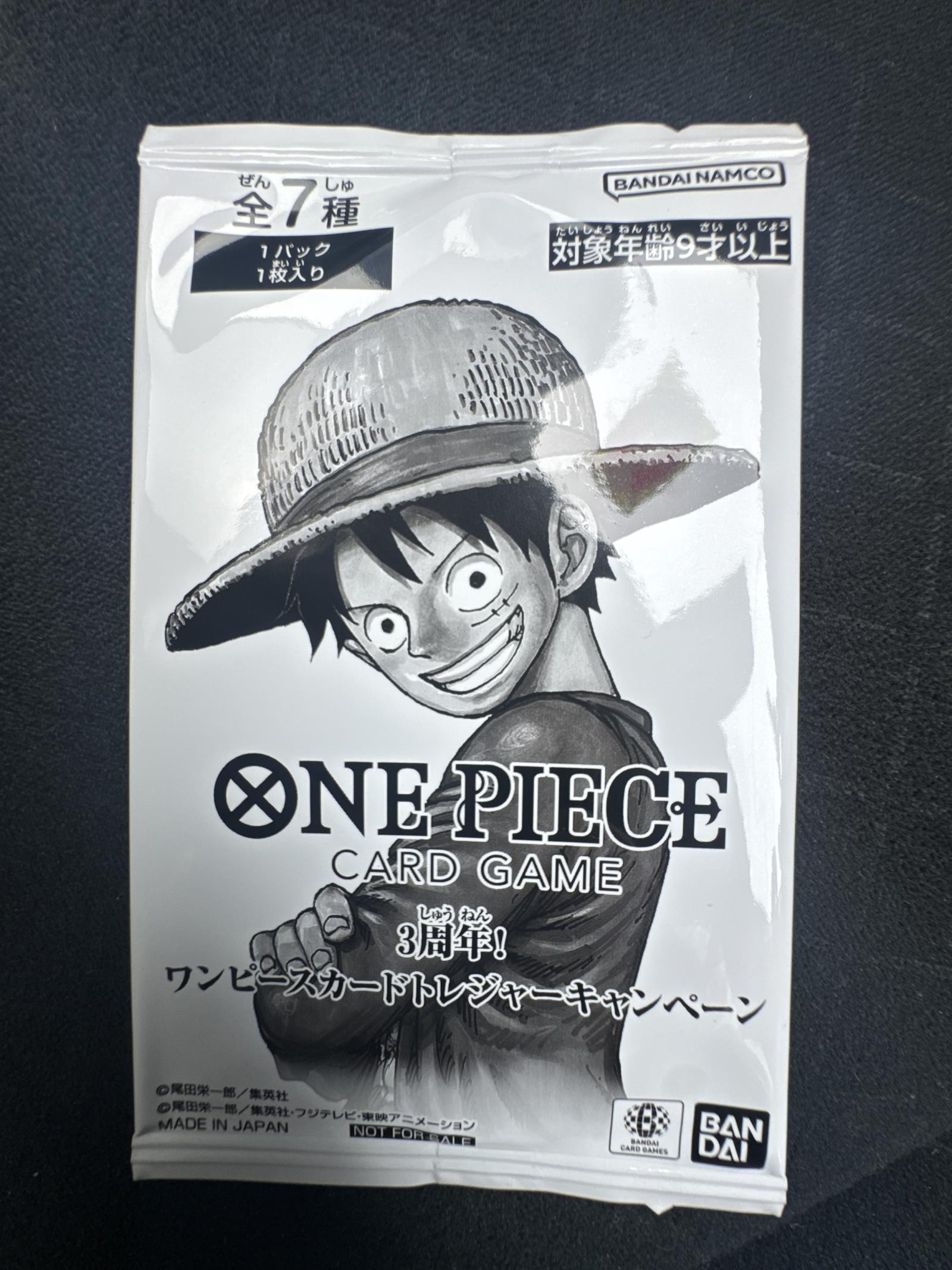 This is a sealed promotional booster pack for the One Piece Card Game, celebrating its 3rd anniversary. It contains one card out of seven possible types. The pack features classic artwork of Monkey D. Luffy and is manufactured by Bandai Namco in Japan. This pack is an excellent collectible for fans of the One Piece trading card game and is suitable for ages 9 and up. The pack is unopened.