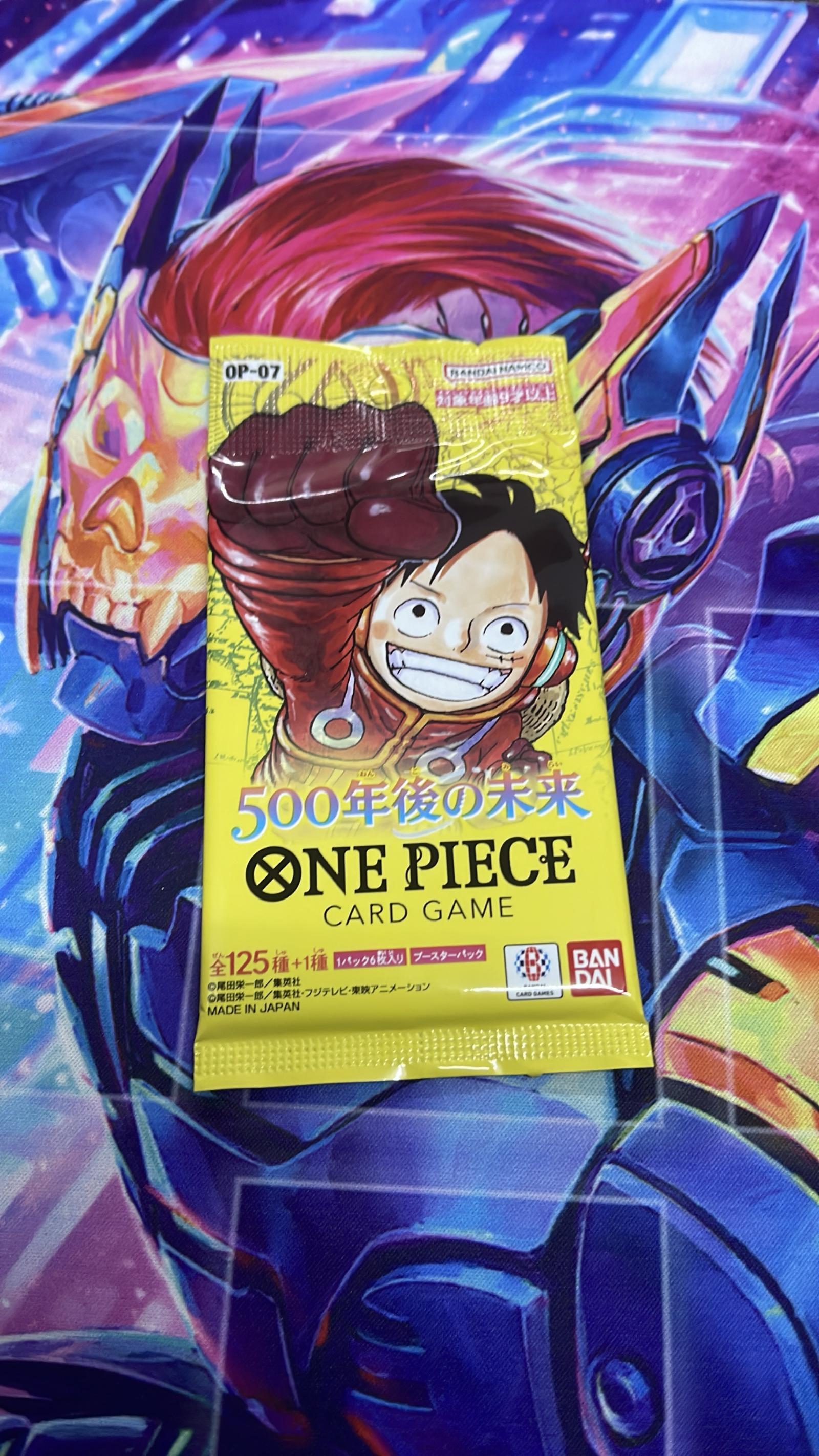 One Piece Card Game booster pack from the set 500年後の未来 (500 Years Later Future), set code OP-07. Japanese language. Contains 6 cards per pack, total set includes 125+1 cards. Made by Bandai Namco. Not a Pokemon TCG card, collectible item from another trading card game.