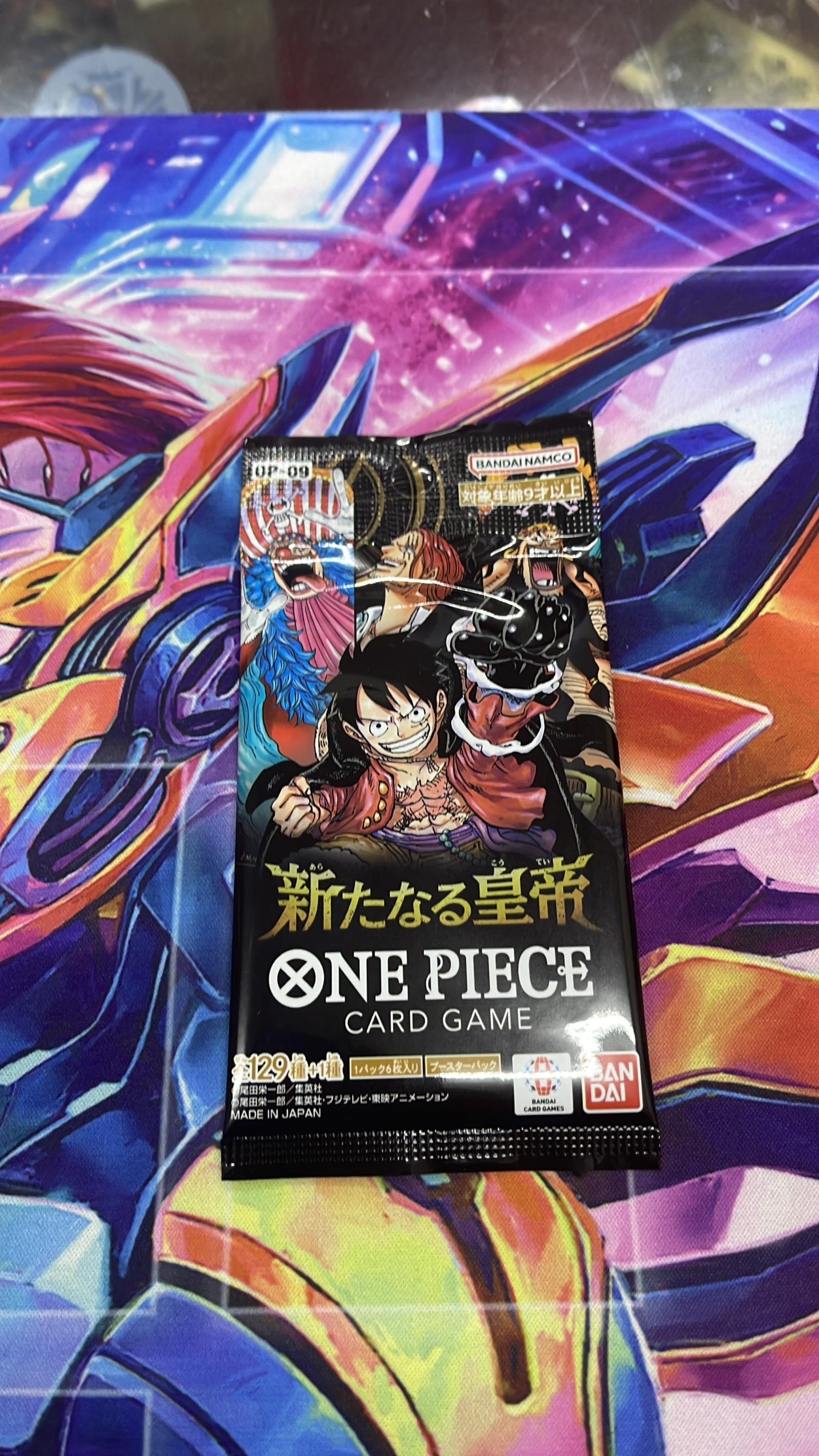 One Piece Card Game booster pack from the 'New Emperor' series (OP-09). Contains 6 cards per pack with a total of 129 cards in the set. Made by Bandai Namco in Japan. The card game features characters from the One Piece anime. Packaging is in Japanese. This is a collectible card game item and not related to Pokémon TCG.
