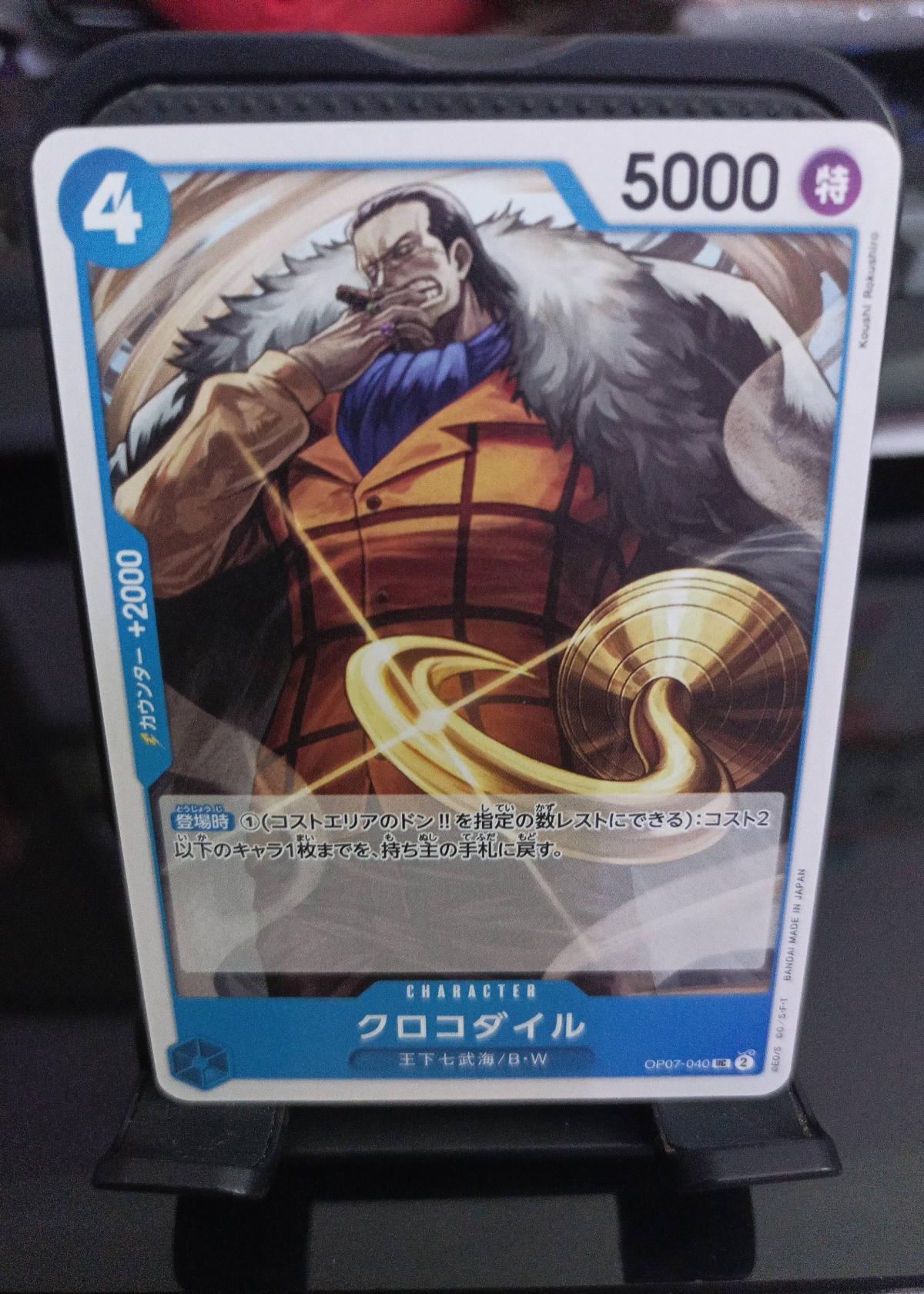 This is a One Piece Card Game trading card featuring the character Crocodile. The card is from OP07-040 and depicts Crocodile in detailed, vibrant artwork. The card includes stats, special abilities, and comes with Japanese text. It is suitable for collectors and players of the One Piece Card Game.
