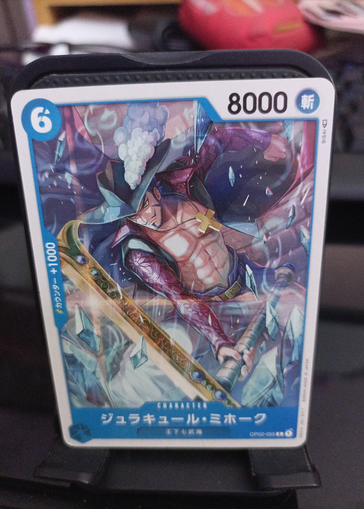 This is a Dracule Mihawk character card from the One Piece Card Game, featuring impressive artwork and stats (power: 8000, cost: 6). The text and symbols on the card are in Japanese. The front and back of the card both display vivid colors with minimal to no visible wear or damage. A great addition for One Piece card collectors or TCG players.