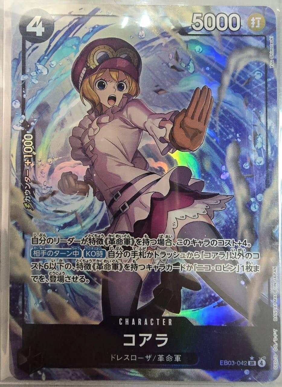 A collectible character card featuring Koala from the One Piece Card Game series. The card number is EB03-042 and it belongs to the SR rarity set. The artwork is by Yuki Shimotsuki. This card showcases Koala in a fighting stance with dynamic holographic effects, making it a special addition for any One Piece Card Game collector.
