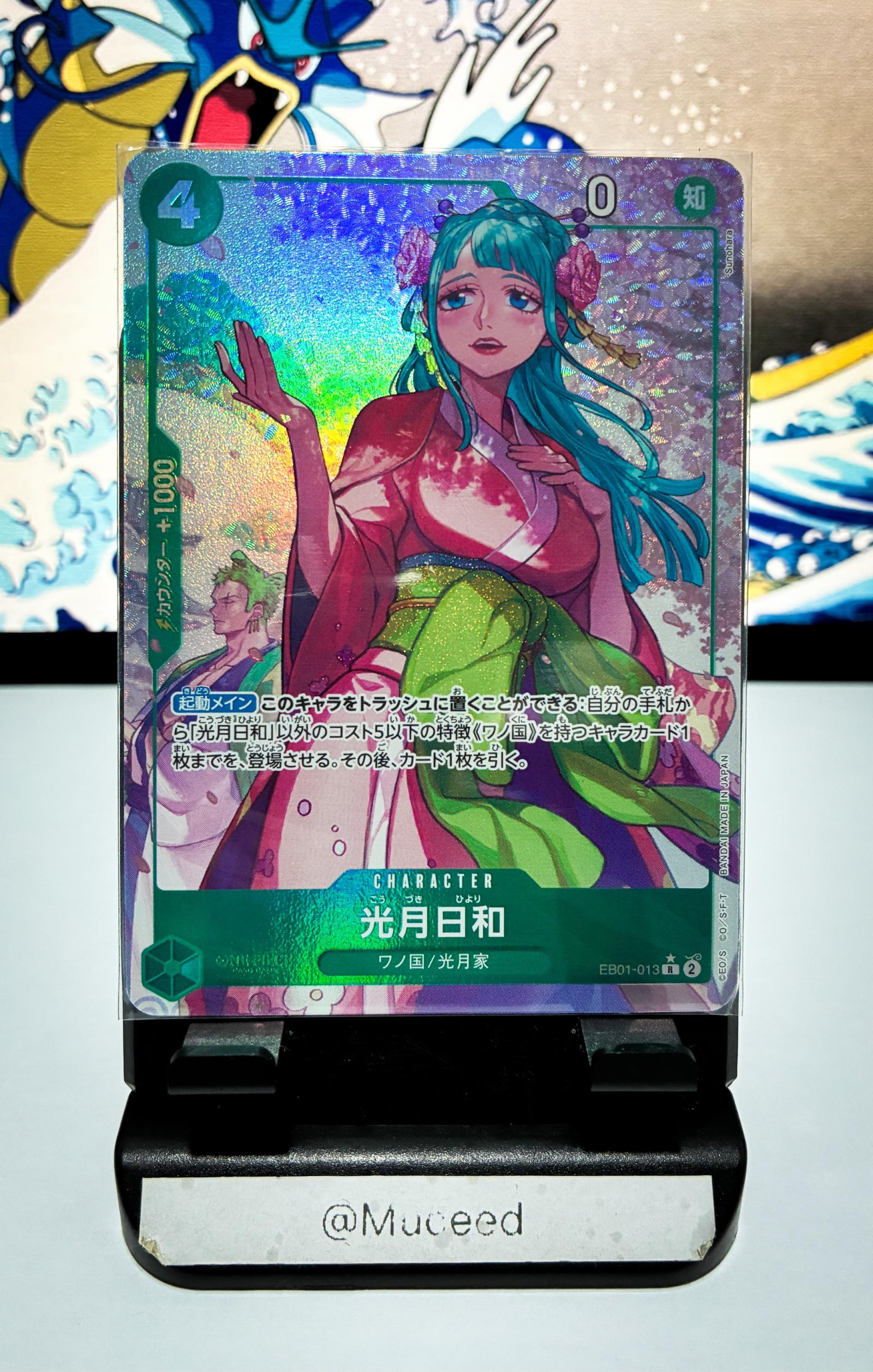 This is a rare foil character card of Hiyori Kozuki from the One Piece Card Game, set EB01-013R. The card features vibrant artwork with a holographic finish, showcasing Hiyori in traditional attire. Text and game stats are in Japanese. A valuable addition for collectors and players alike.