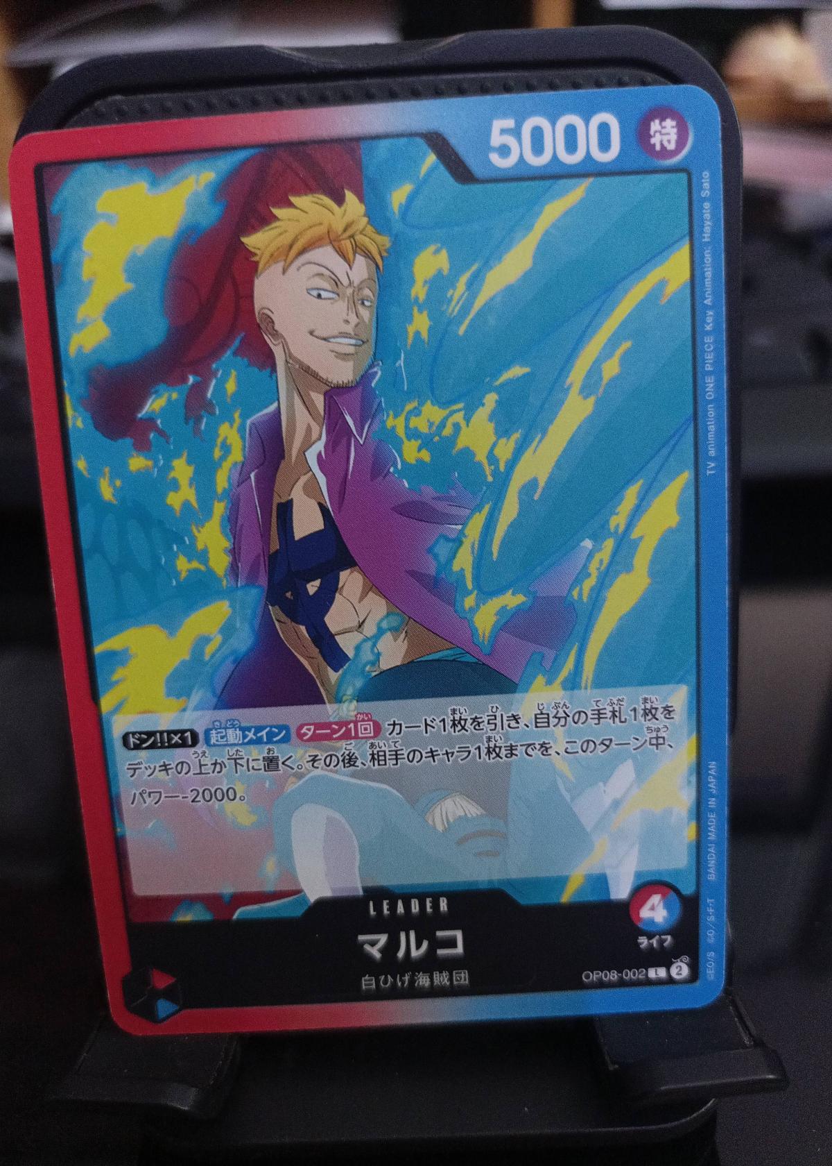 This is a Japanese One Piece Card Game Leader card featuring Marco from the Whitebeard Pirates (OP08-002). The card shows Marco in vibrant art with a power of 5000. It includes Japanese text describing the card's abilities and is part of the official Bandai One Piece Card Game series.