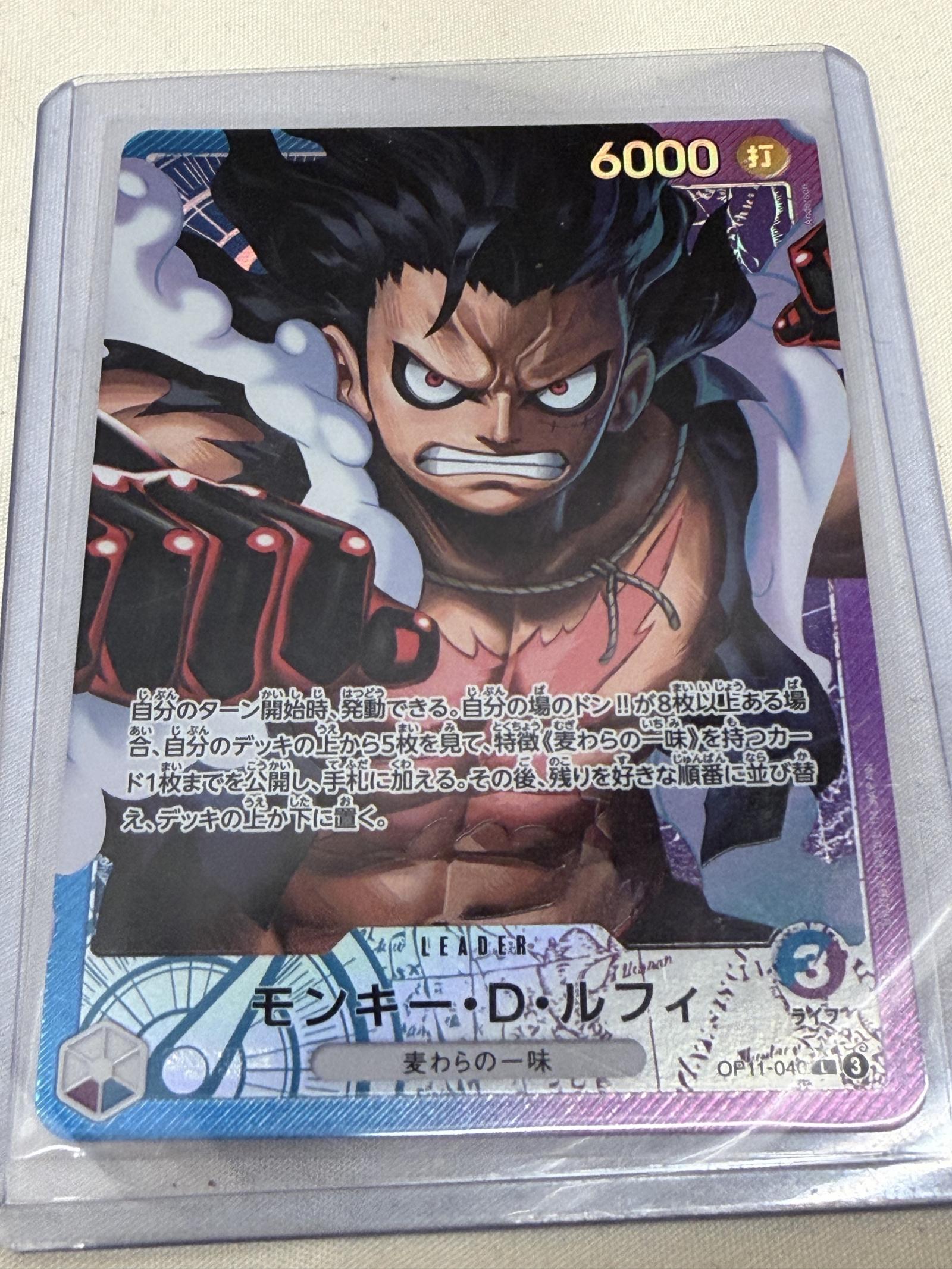 This is a One Piece Trading Card Game featuring Monkey D. Luffy as the leader character. The card has game stats and effects printed in Japanese. It is sleeved for protection and features vibrant artwork of Luffy in a battle stance. The card is a part of the set with code OP11-04.
