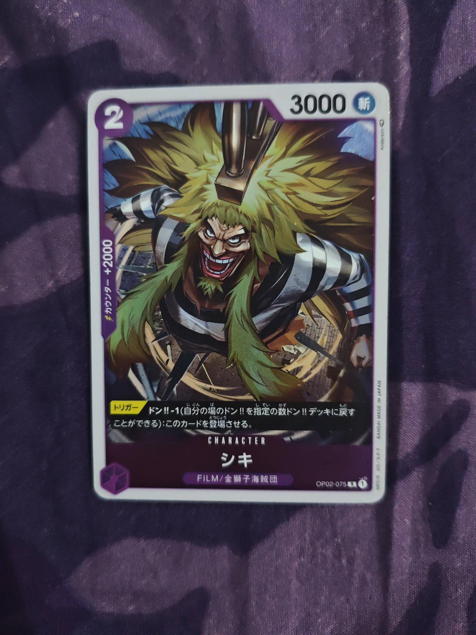 This is a One Piece Trading Card Games card featuring the character Shiki with 3000 power. The card includes Japanese text and is part of the OP02 series, number 075. The card has vibrant colors and clear details on both front and back, with the official One Piece Card Game logo on the reverse side.