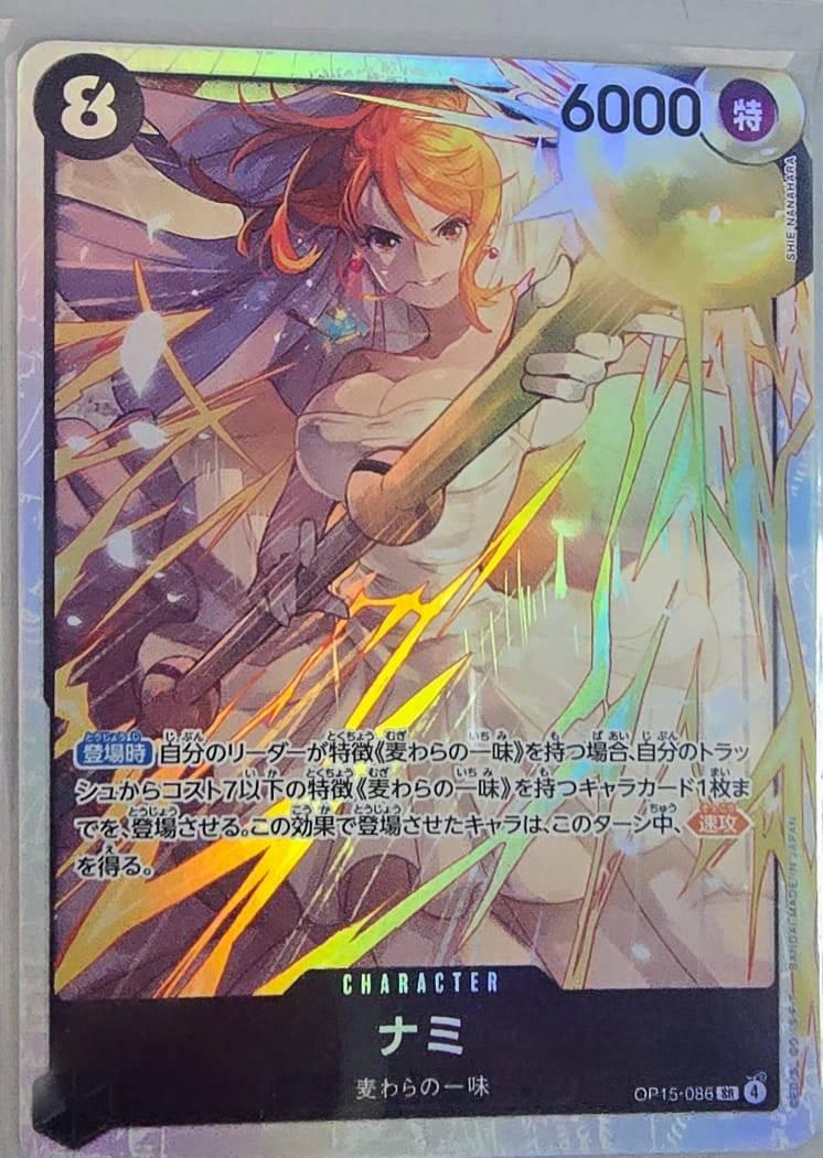 This is a holographic character card featuring Nami from the One Piece Card Game, item number OP15-086. The card showcases artwork by Shiei Nanahara and includes special game stats and abilities. It is a collectible card with a high-quality finish, making it a valuable item for fans and collectors.