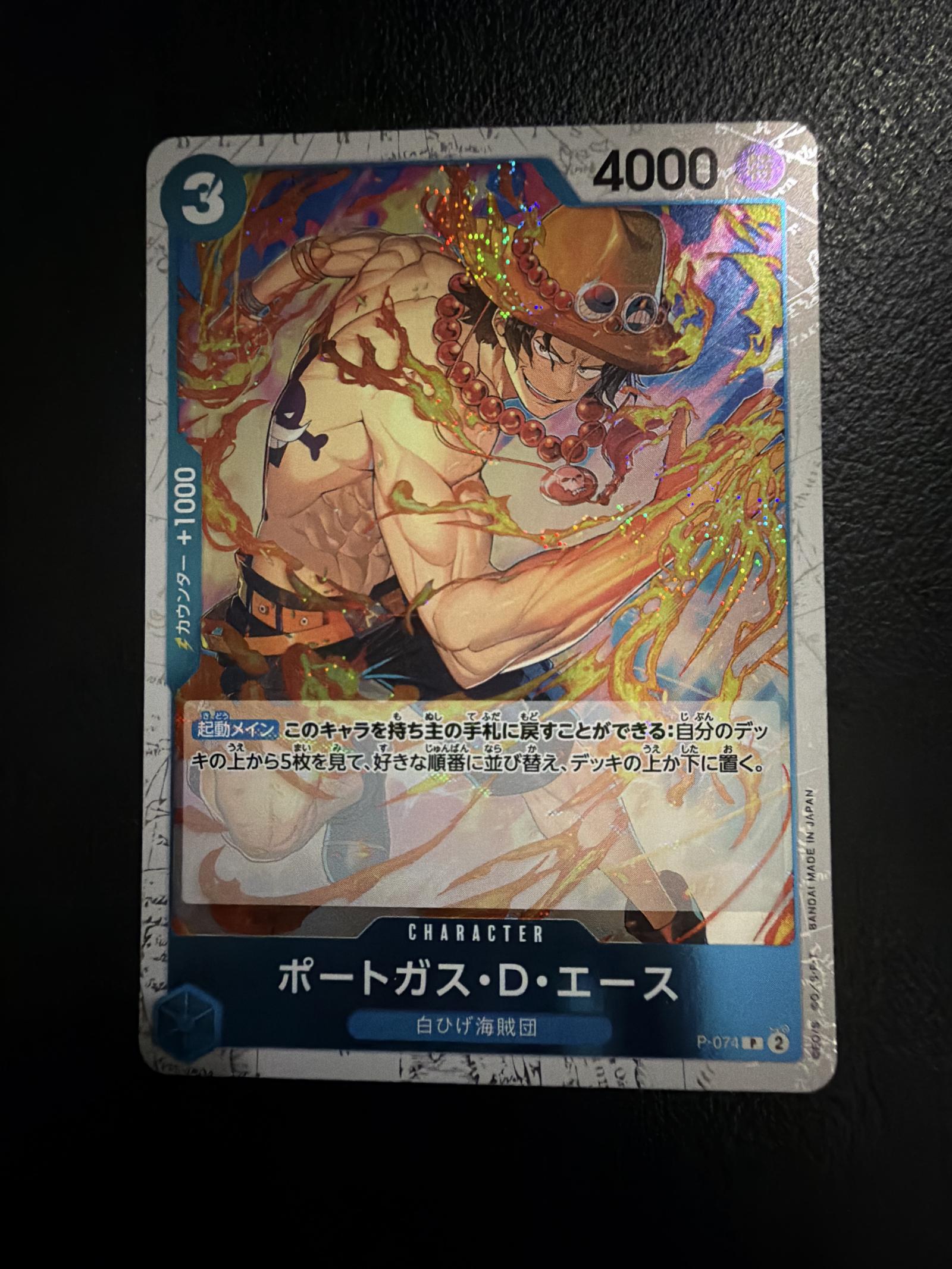 A foil character card featuring Portgas D. Ace from the One Piece Card Game. The card displays vibrant artwork and has text in Japanese. It is part of the Bandai One Piece series, numbered P-074. Great addition for collectors or players.