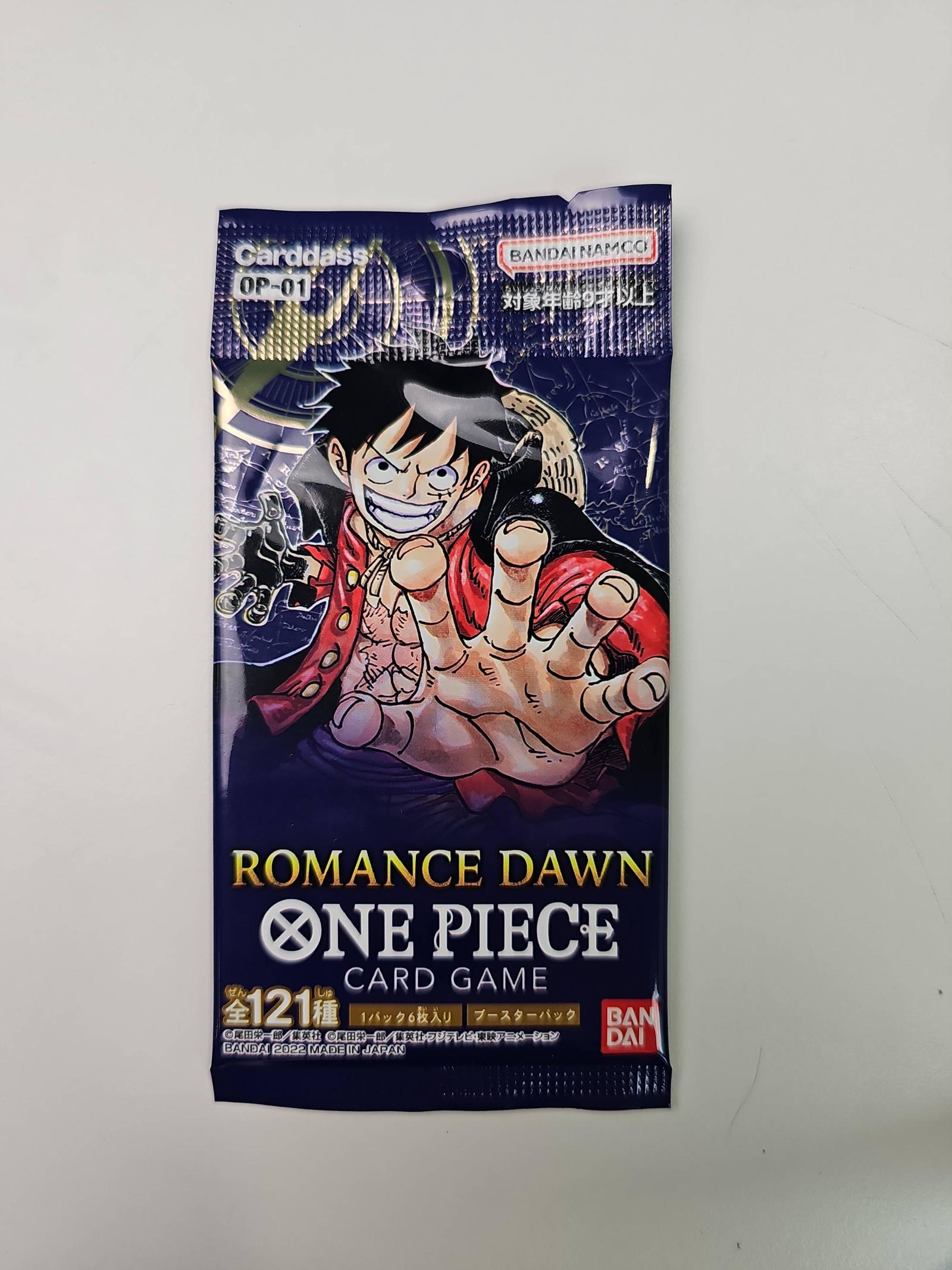 Sealed booster pack from the One Piece Card Game: Romance Dawn set, featuring 6 cards per pack. Official Bandai product from 2022 made in Japan. Suitable for ages 9 and up. Collectible trading card game booster pack with one of 121 possible card variants.