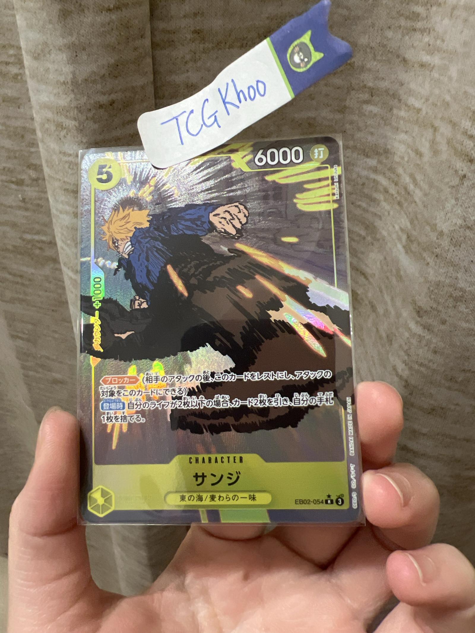 A One Piece Trading Card Game character card featuring Sanji (EB02-054) in excellent condition. The card showcases Sanji with holographic effects and Japanese text. It is sleeved for protection and the card's edges and corners appear sharp with no visible wear. The back of the card is clean and intact.