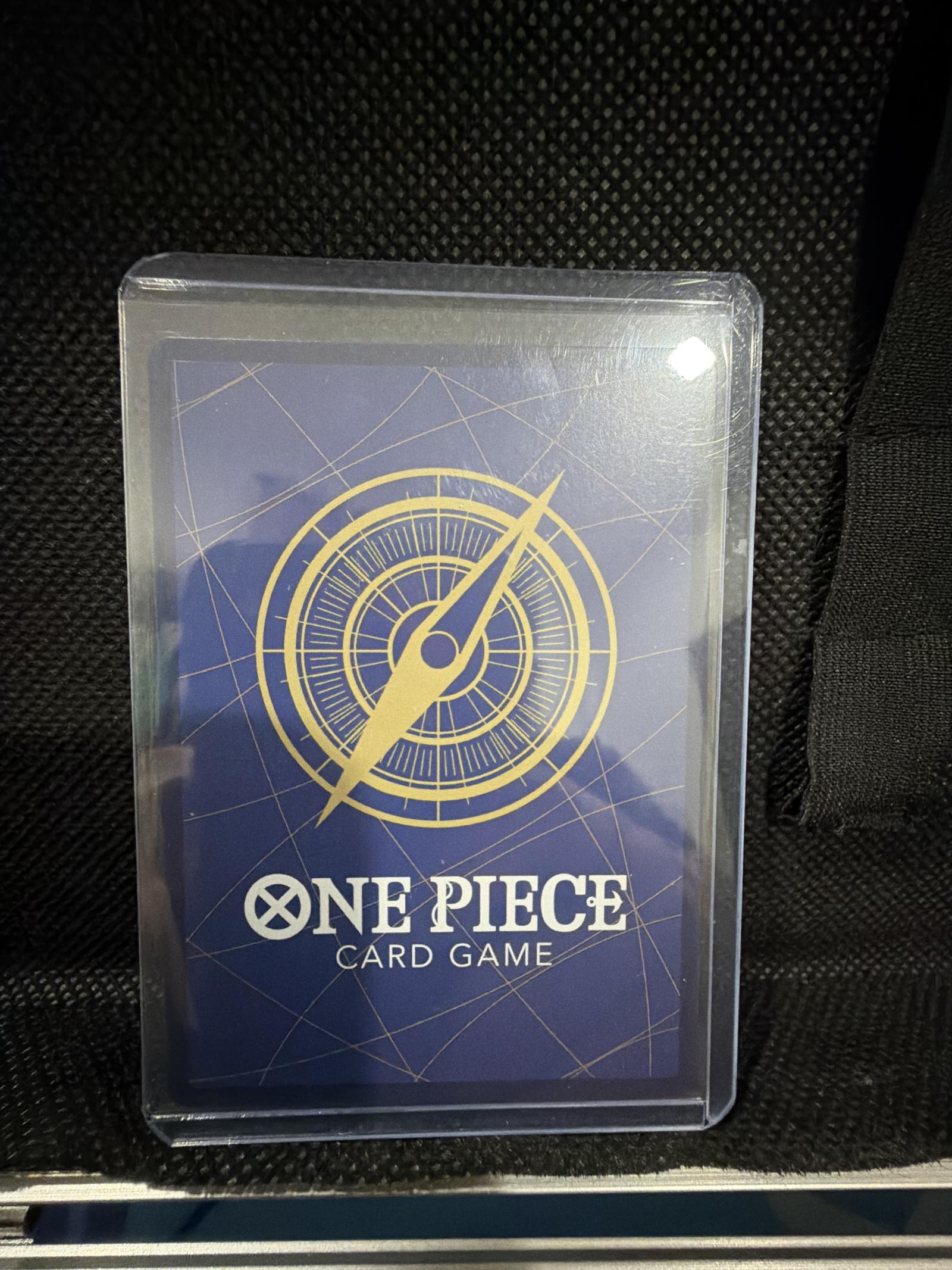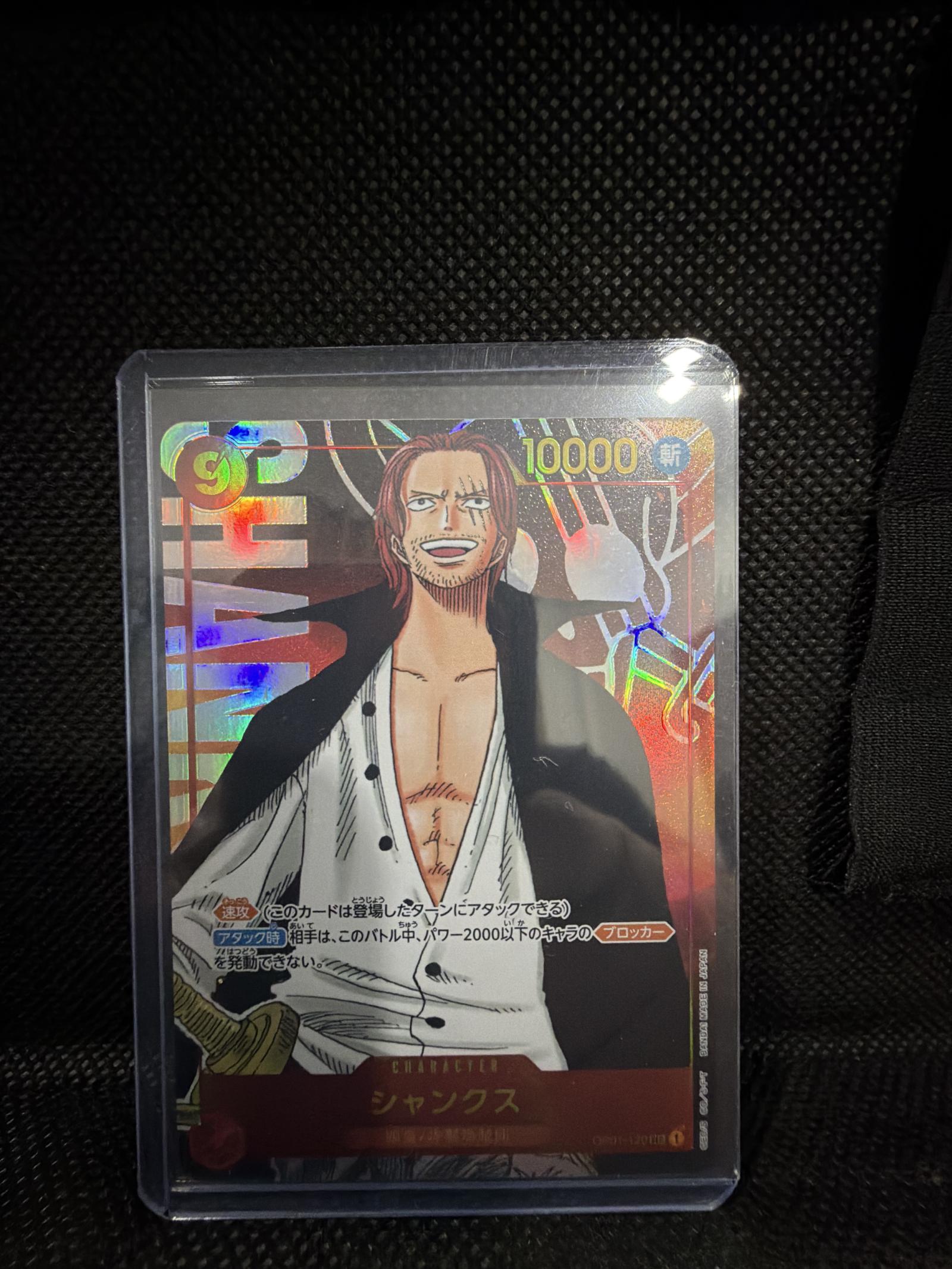This is a rare holographic One Piece trading card featuring Shanks with 10000 power. The card is sleeved and well preserved with vibrant colors and clear print. Perfect for collectors of the One Piece Card Game.