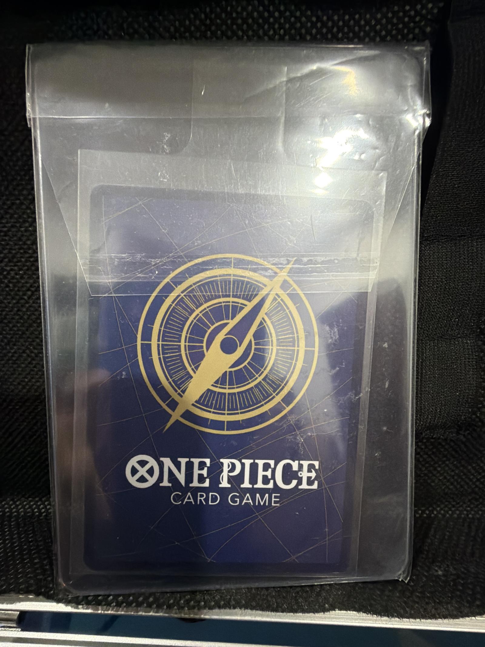 A One Piece Card Game trading card featuring the character Silver Rayleigh. This character foil card is in a protective sleeve showcasing its holographic details. Text is in Japanese. Suitable for collectors and fans of the series.