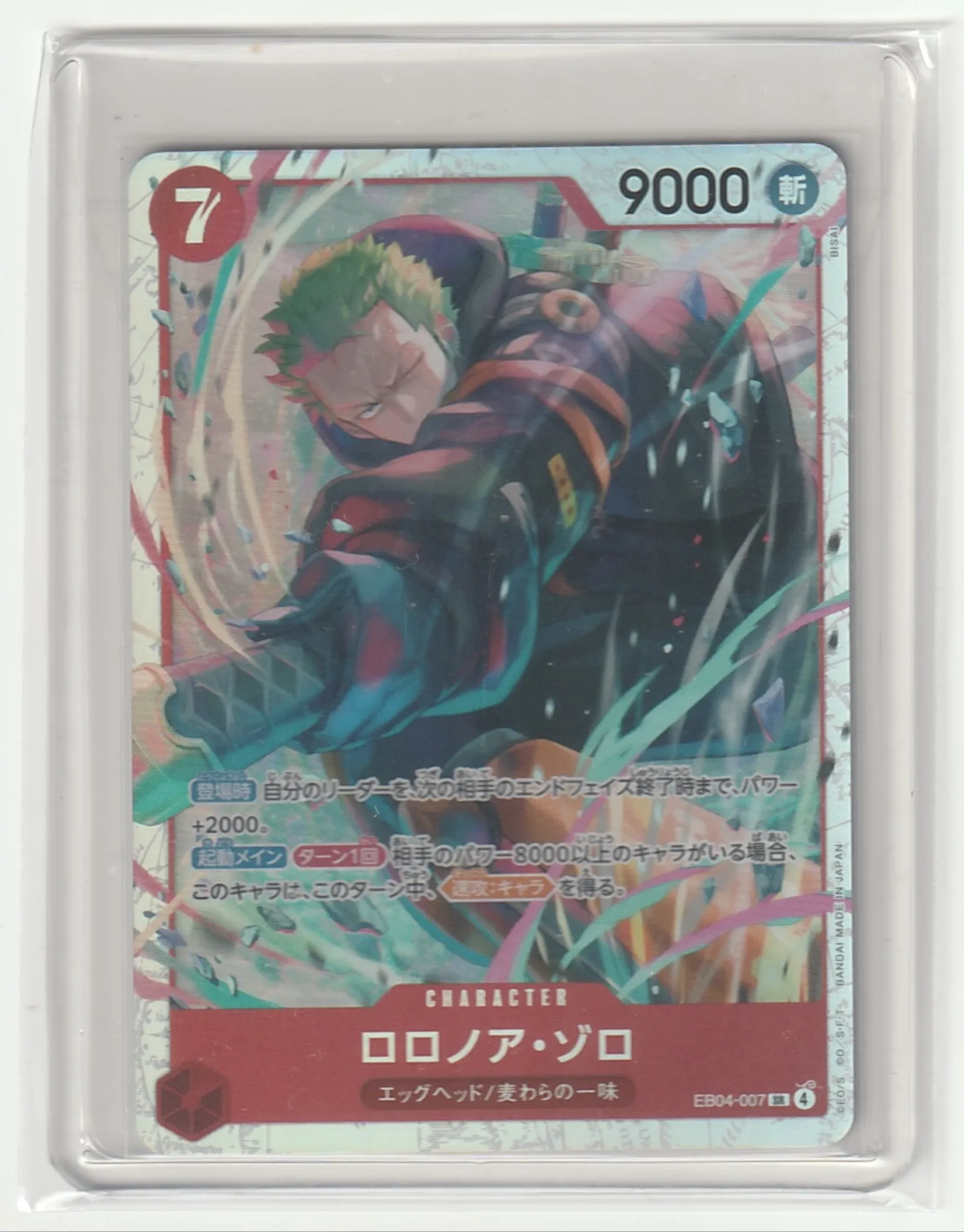 This is a One Piece Trading Card Game character card featuring Roronoa Zoro with 9000 power. The card is sleeved for protection and shows colorful artwork with Japanese text. Ideal for collectors or players of the One Piece TCG.