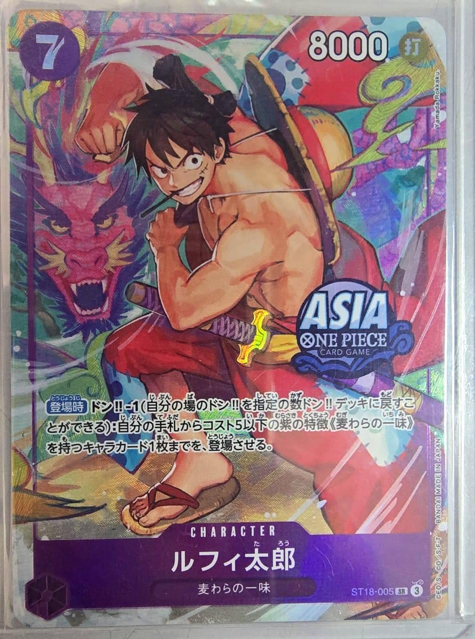 This collectible card features Luffy Taro from the One Piece Card Game series. The card number is ST18-005 and it is a Super Rare (SR) card. It showcases vibrant artwork by Eiichiro Oda, the creator and artist of the One Piece series. The card is in a protective sleeve making it a valuable addition for fans and collectors of One Piece memorabilia.