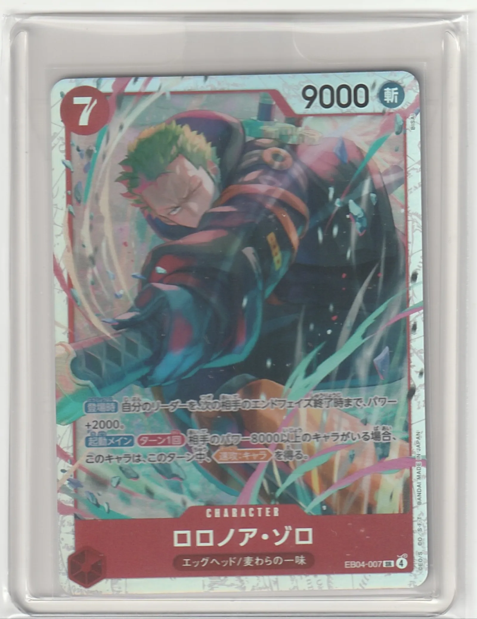 This is a One Piece Trading Card Game character card featuring Roronoa Zoro with 9000 power. The card is sleeved for protection and shows colorful artwork with Japanese text. Ideal for collectors or players of the One Piece TCG.