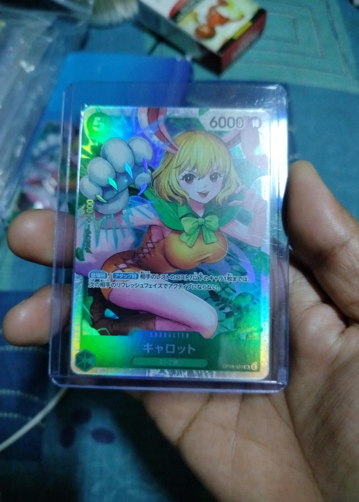The card is in near mint condition, showing no major signs of play or wear and carefully kept in a protective plastic sleeve for preservation. As an ungraded collectible, it offers excellent potential for grading or immediate use in your deck or display. SR foils like this are often sought after for both their gameplay utility and high collectibility—Carrot cards are especially popular among fans of the character. Perfect for fans of One Piece, TCG enthusiasts, or those looking to enhance their collection with a bright, premium holographic card.