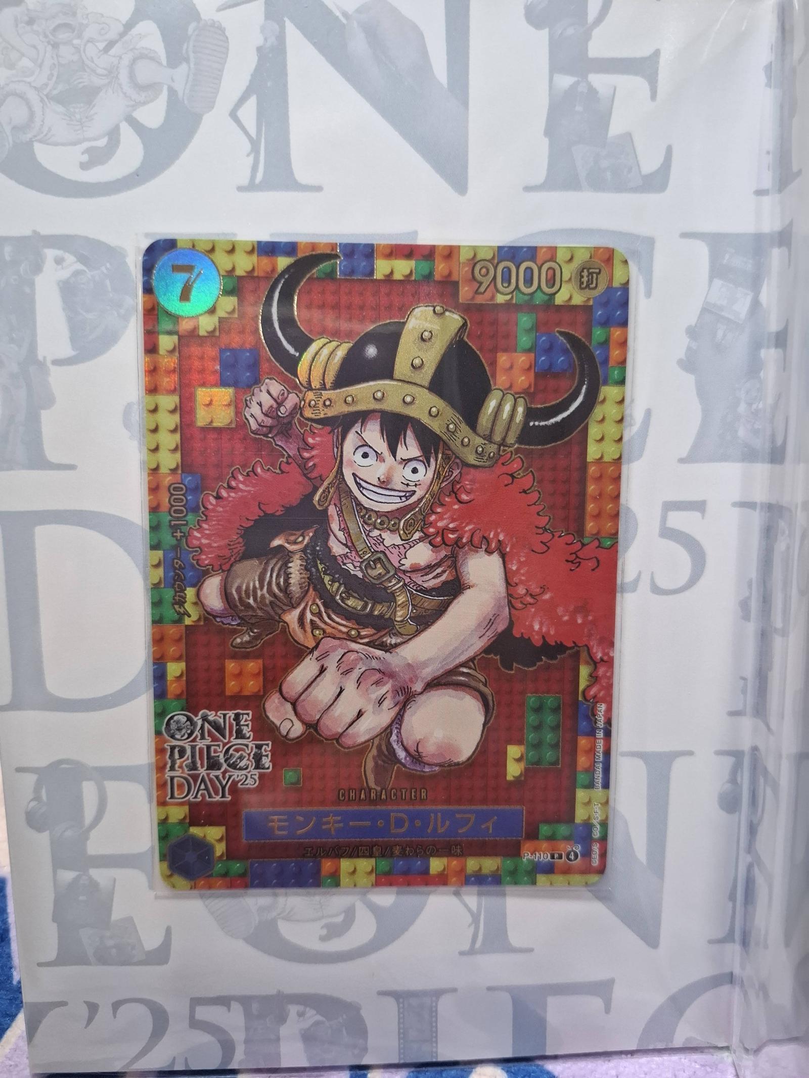 Notable features: holofoil treatment across the front, event-exclusive ONE PIECE DAY ’25 branding on the reverse, eye-catching alternate costume (helmet + red fur coat) of Luffy that differs from standard retail releases. As an event card, it carries collectible appeal to fans of One Piece and collectors of promotional/limited-run pieces. Condition and strong holo reflect well for display or for inclusion in a character-focused collection.