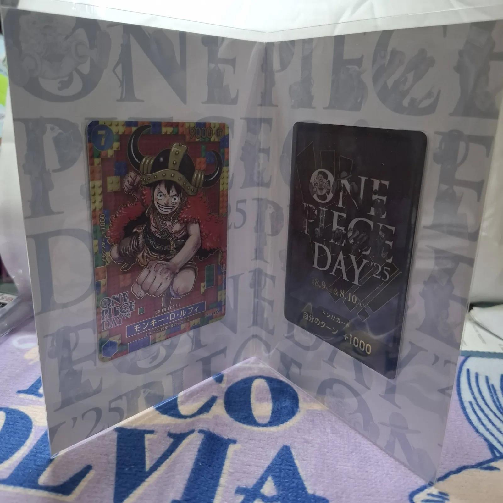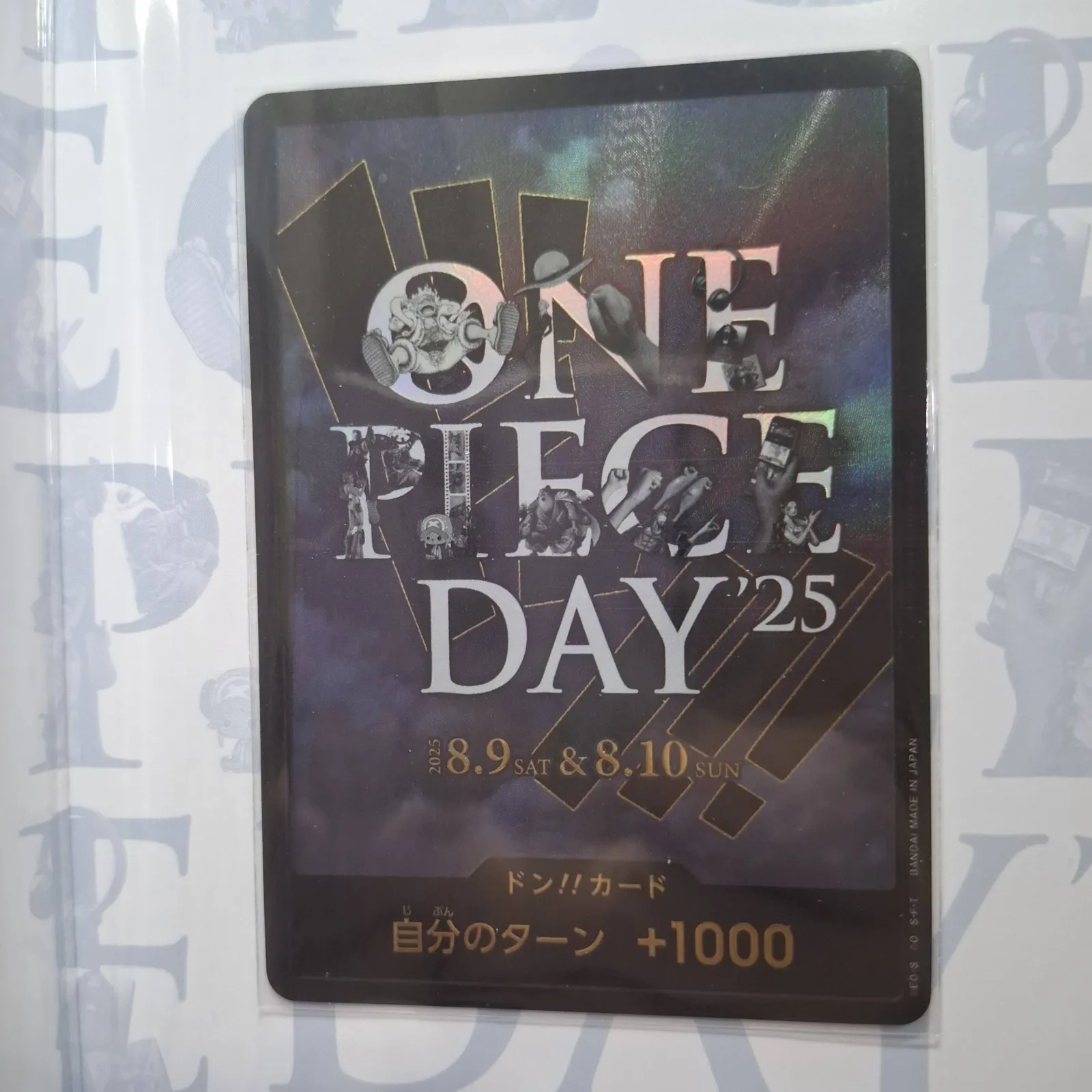 This is the One Piece DAY ’25 promotional/character card (Japanese text). Card face shows game values (7 in the upper-left and 9000 in the upper-right) and the lower-left ONE PIECE DAY logo. Reverse artwork includes the event branding and printed dates (8.9 Sat & 8.10 Sun 2025), confirming this is an event-release card. Artist credit is not printed on the card face; no explicit artist name is provided on the card itself.