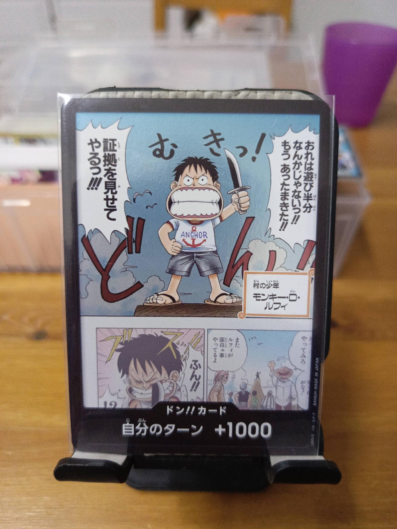 A trading card from the One Piece Don! Card series featuring a humorous, chibi-style Monkey D. Luffy wielding a knife with a +1000 turn boost effect. The card is protected in a plastic sleeve and stand, showing characters and dialogue in Japanese. Ideal for collectors or players of the One Piece TCG.