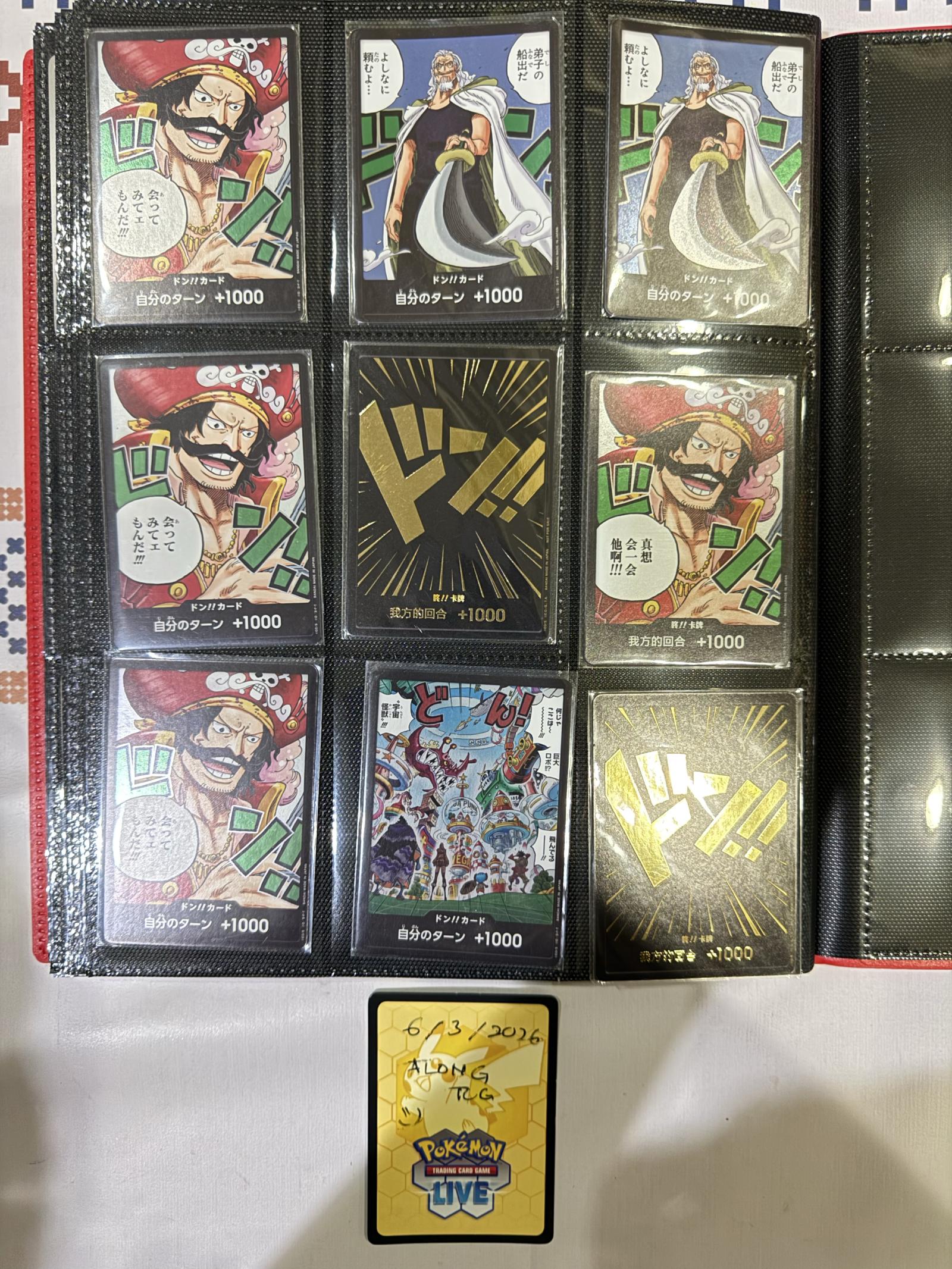 A collection of One Piece Don!! trading cards featuring Monkey D. Luffy and other characters. Cards have Japanese text and depict various action scenes with +1000 bonuses. The cards are held in a black binder sleeve, showing minimal wear and bright colors. Ideal for fans and collectors of One Piece TCG items.