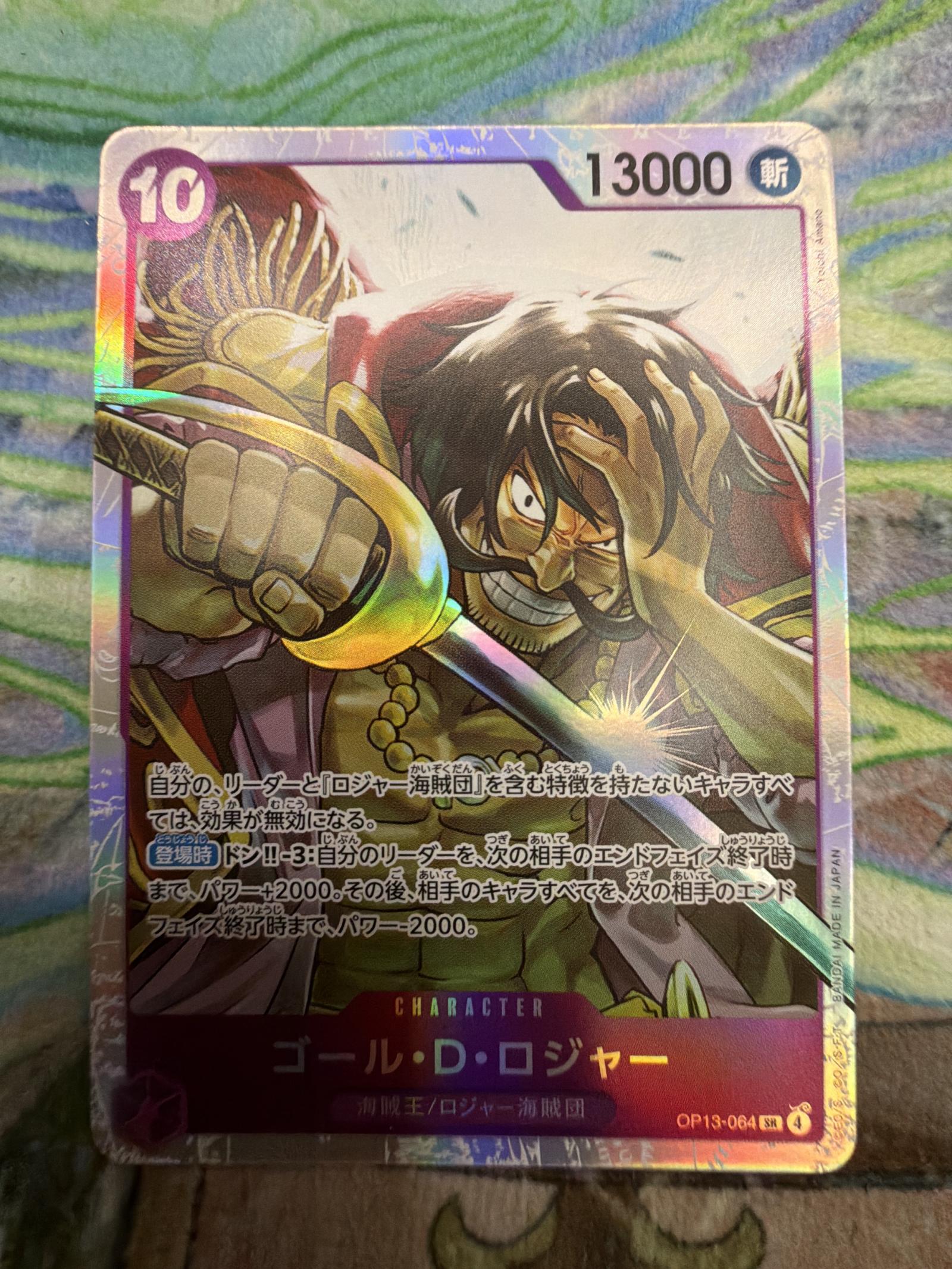 A holographic Gold D. Roger character card from the One Piece Trading Card Game, featuring powerful stats and unique abilities. The card is coded OP13-064 SR and shows the legendary pirate with his sword drawn. Text is in Japanese.