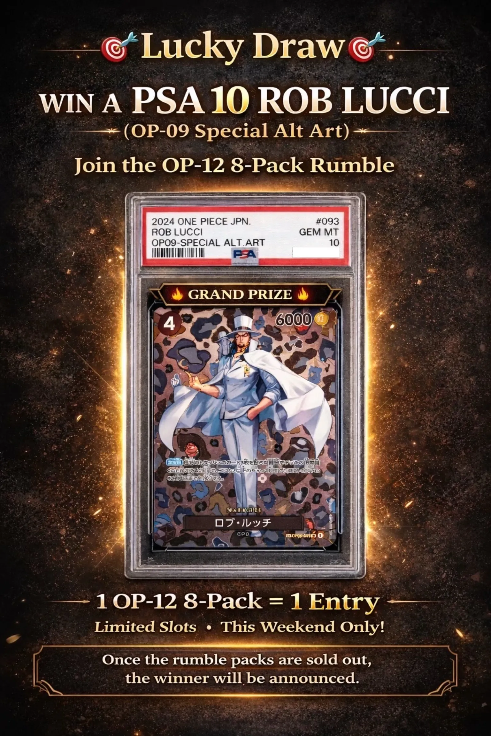 Join our lucky draw where you might get a chance to win a PSA 10 Rob Lucci. All you have to do is buy 1 slot to enter 1 name, so 1 Slot = 1 Name. We will announce the winner by using a wheelspin once the rumble packs are sold out! GOODLUCK!!
