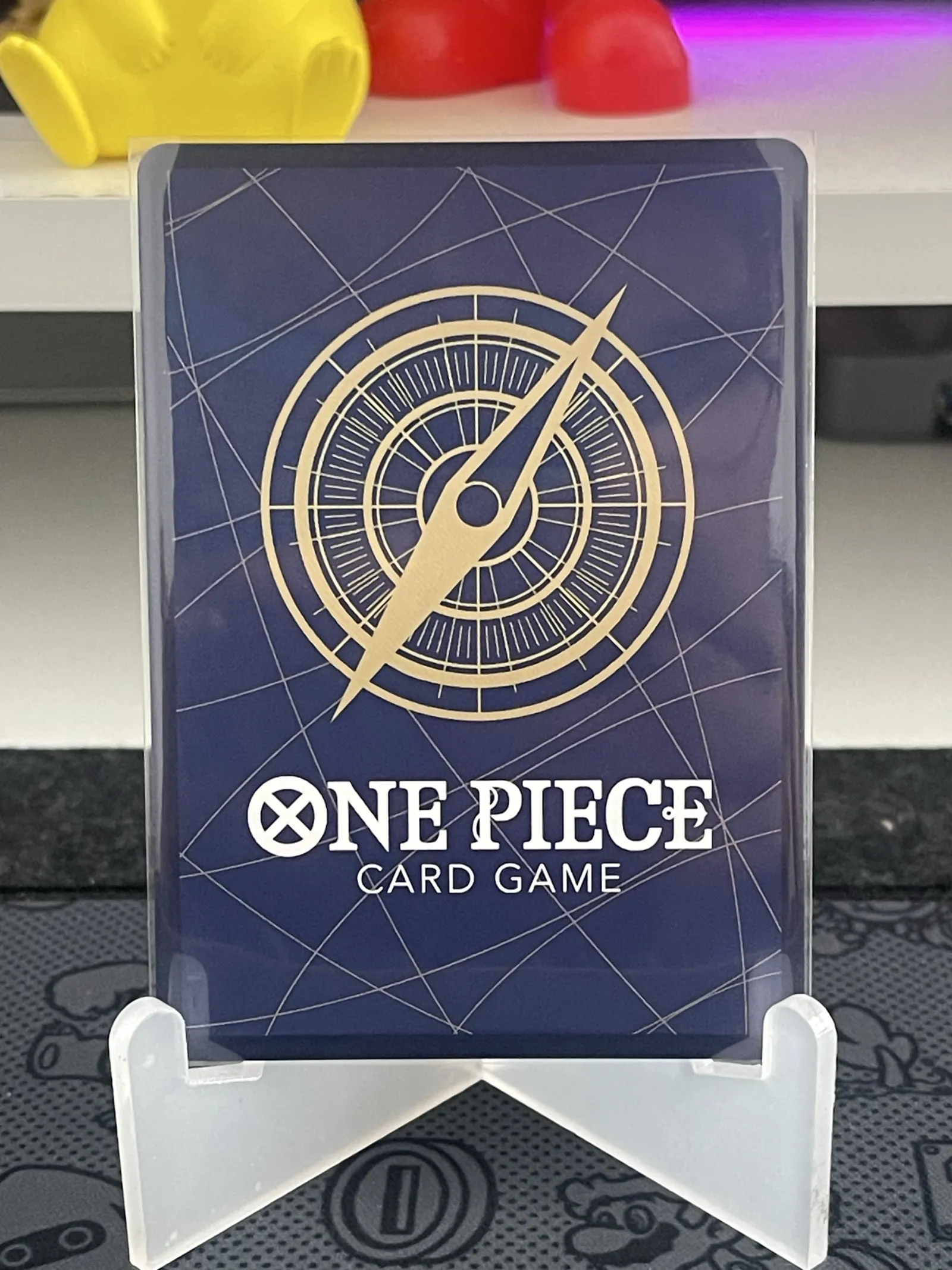 A One Piece Trading Card Game character card featuring Portgas D. Ace. The card showcases detailed artwork of Ace with manga panels in the background. Text and game stats are visible in Japanese. The card is displayed in a protective sleeve on a stand.