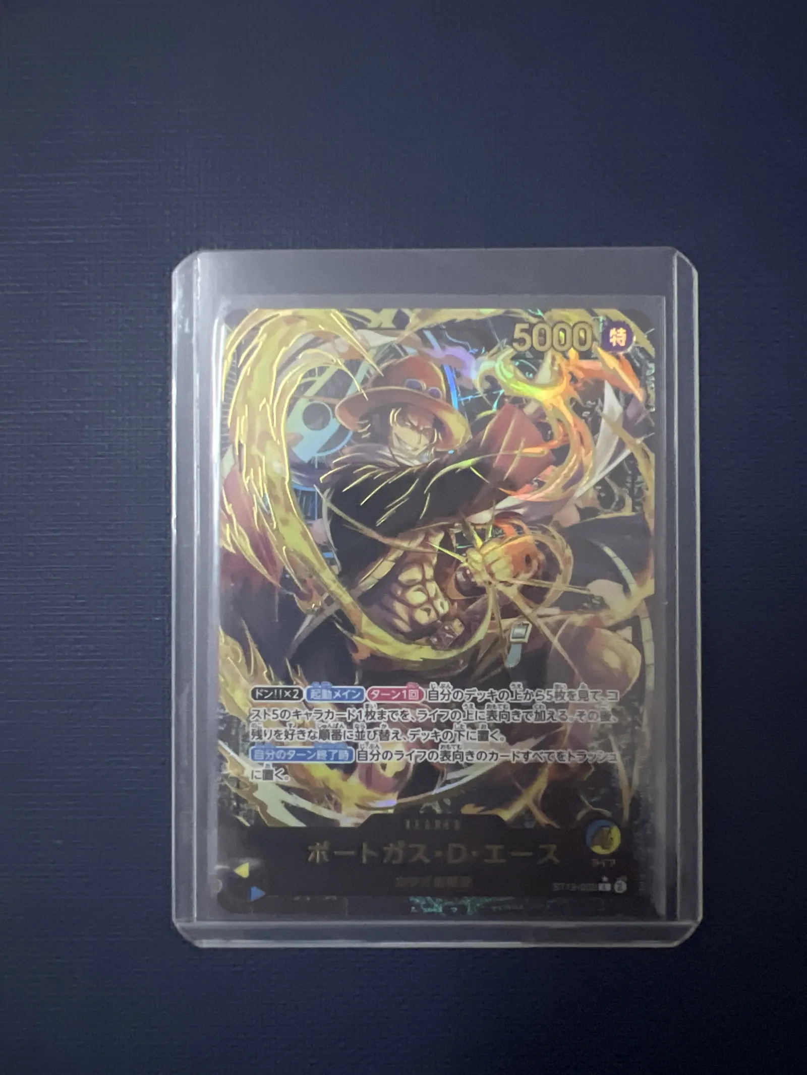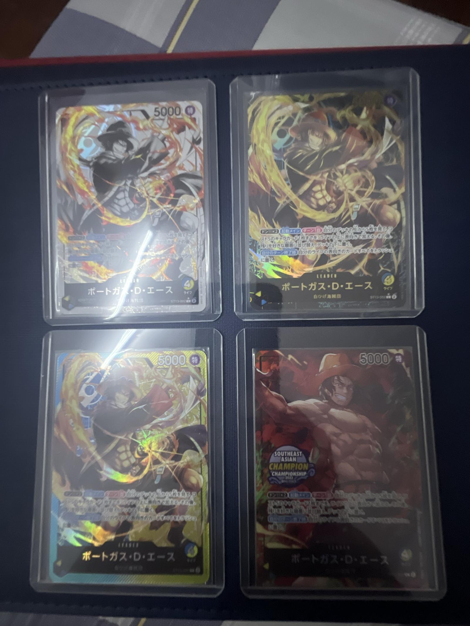 A collection of four One Piece trading cards featuring Portgas D. Ace. Includes various holographic designs with vibrant artwork showcasing Ace's fiery abilities. Cards are stored in protective sleeves for safe keeping. Perfect for collectors and fans of the One Piece Trading Card Game.