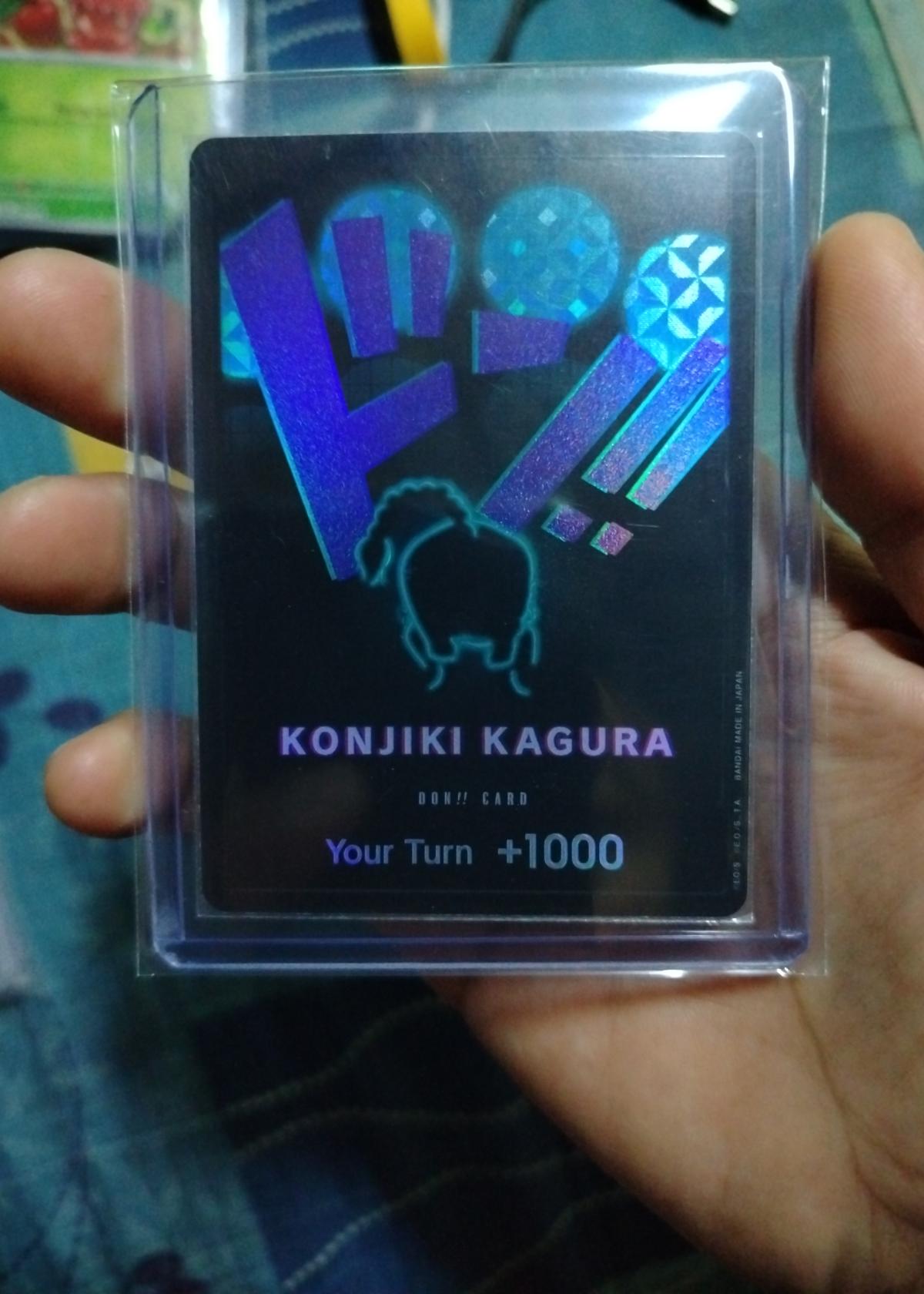 The KONJIKI KAGURA DON!! Card is unique to Bandai's One Piece card games, and is not part of the Magic: The Gathering universe. The card's effect, 'Your Turn +1000,' suggests an in-game use, though its main appeal lies in its collectible nature, especially for fans of cross-promotional or exclusive card releases. Artist and set details are not listed on the card, adding to its mystery and intrigue.
