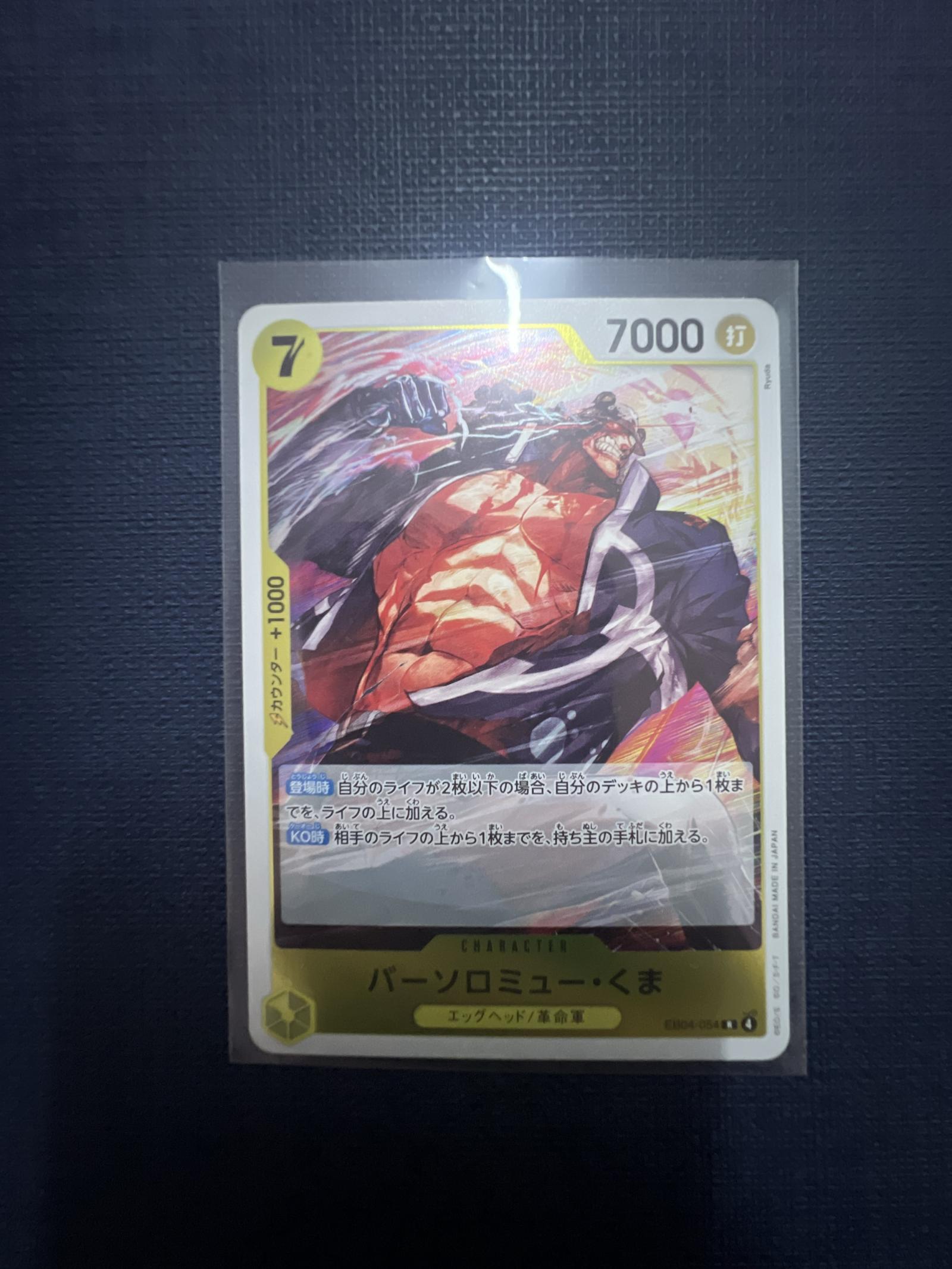 A One Piece Trading Card Game character card featuring Bartholomew Kuma with 7000 power. The card is in Japanese and shows detailed art of Kuma in an action pose. It is sleeved in a protective cover to maintain its quality.