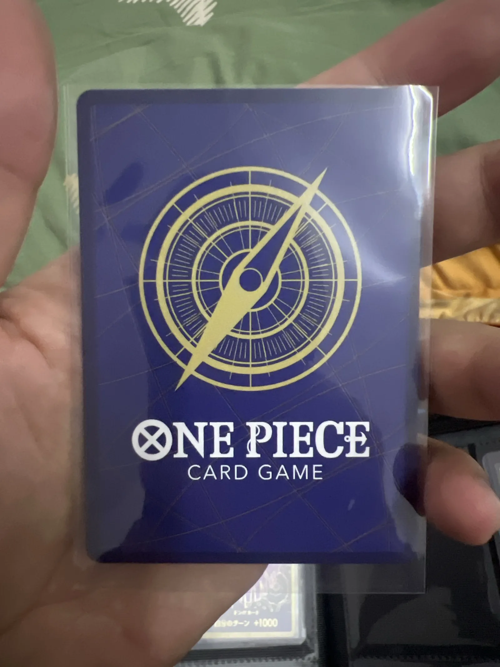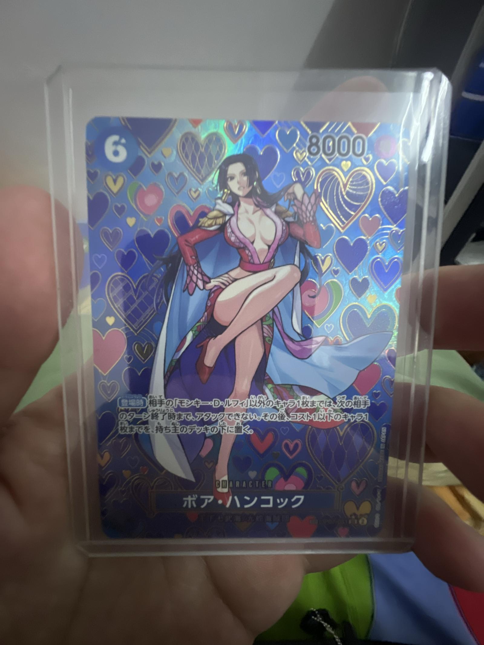 Rare One Piece Trading Card Game featuring Boa Hancock with vibrant holographic heart pattern background. The card is sleeved in a protective case and shows minimal signs of handling. Text and artwork are crisp and clear, ideal for collectors and players alike.