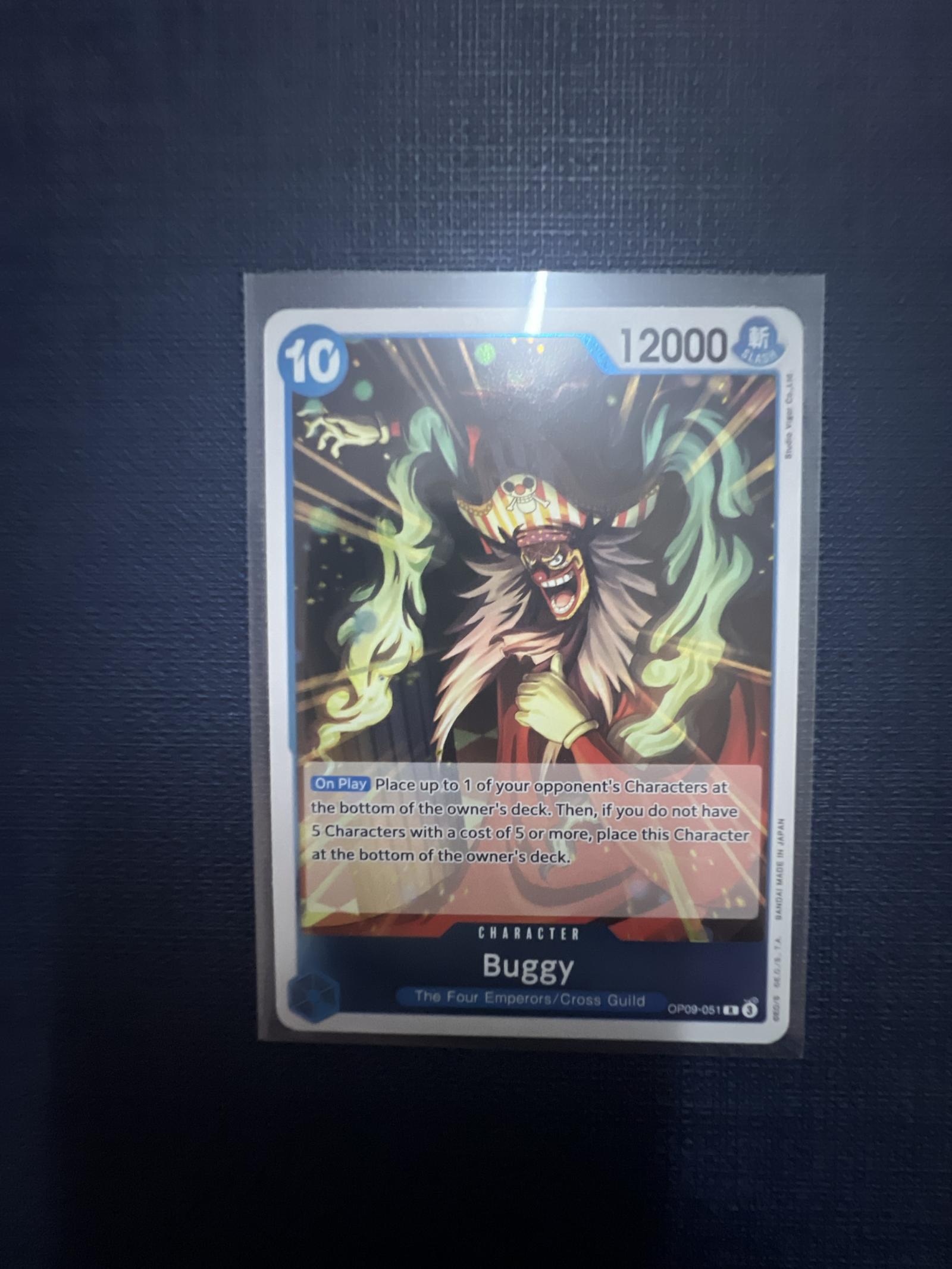 This is a One Piece Trading Card Game character card featuring Buggy from The Four Emperors/Cross Guild set. The card has a power of 12000 and a cost of 10. It includes a unique on-play ability that interacts with opponent's characters. The card is sleeved and appears to have slight scratches and minor edge wear visible in the photo.