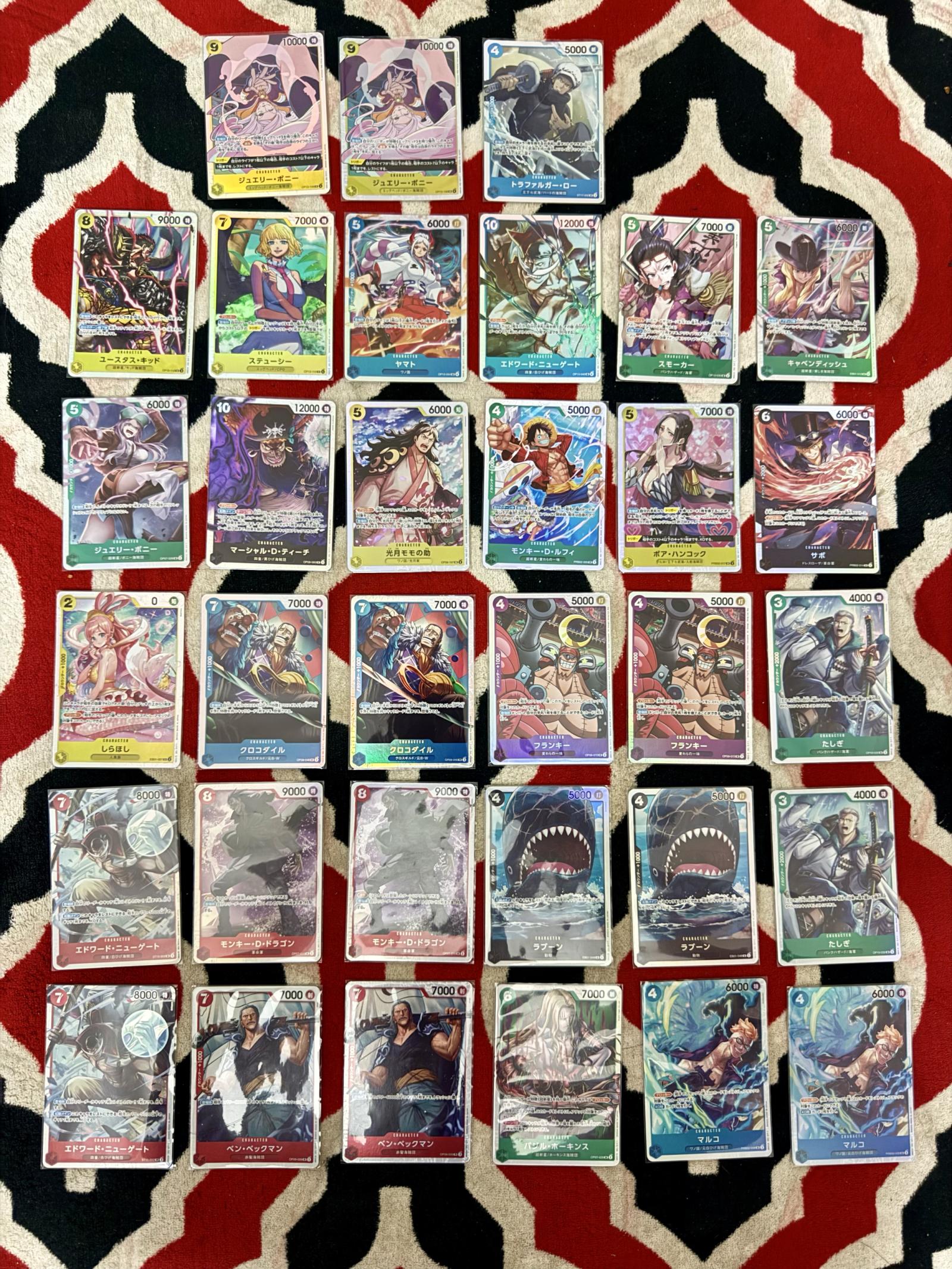 A collection of 43 One Piece Trading Card Game cards featuring popular characters such as Monkey D. Luffy, Crocodile, Yamato, Franky, Trafalgar Law, and others. The set includes various card types and power levels, showcasing vibrant artwork from the One Piece series. Cards are shown laid out on a patterned surface for display.