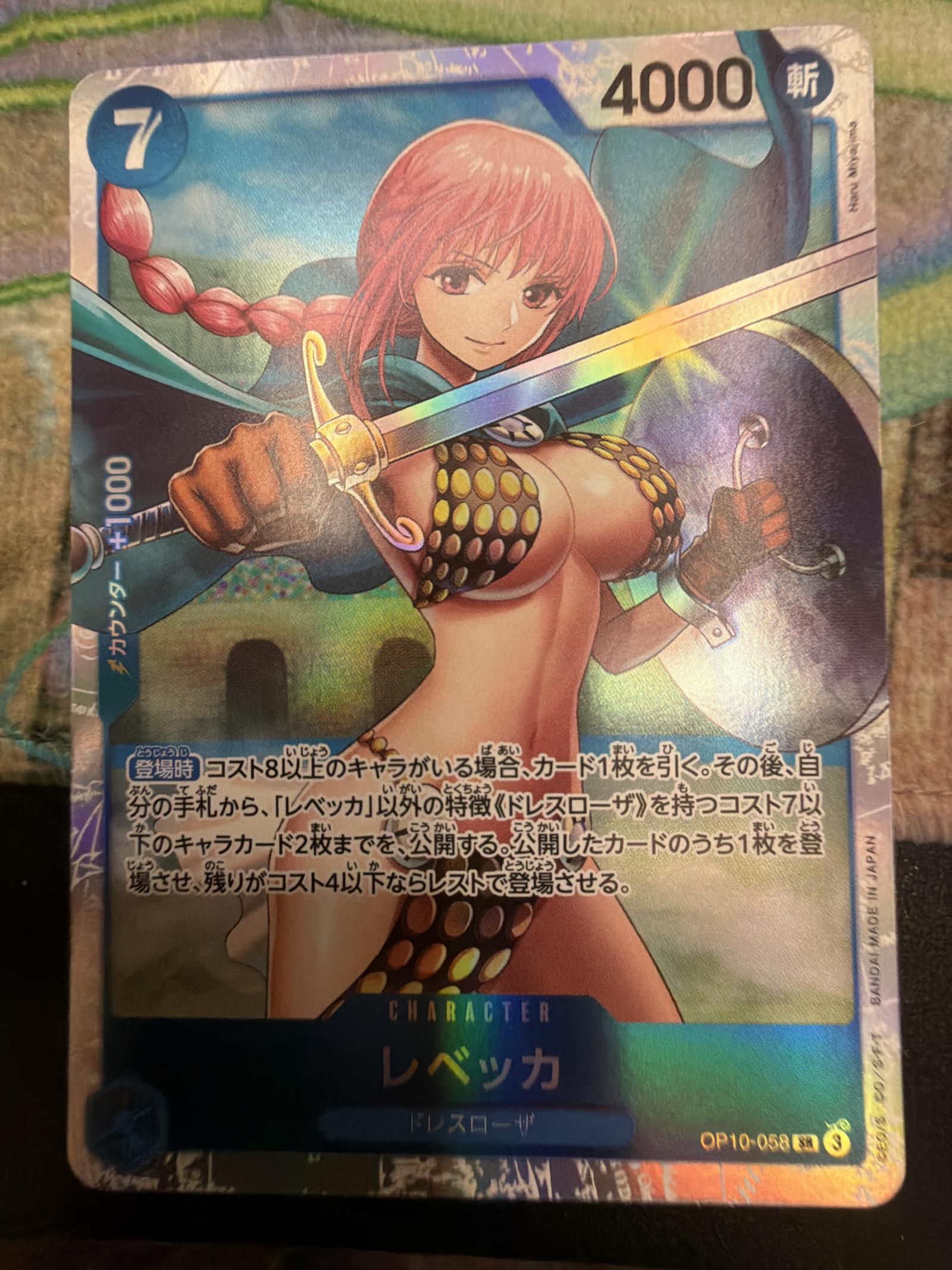 This is a One Piece Trading Card Game character card featuring Rebecca from Dressrosa. It has a holographic finish and includes game stats in Japanese. Ideal for collectors and players of the One Piece TCG series.